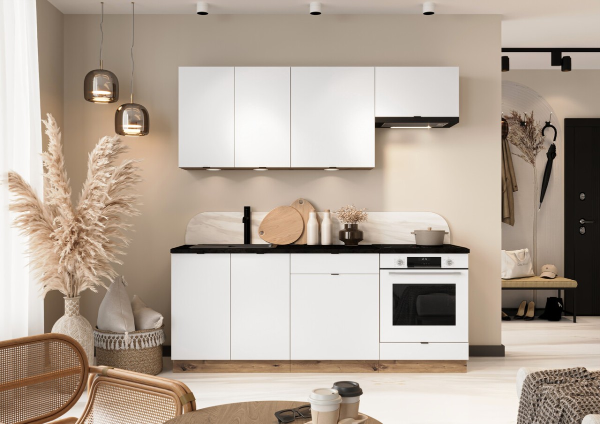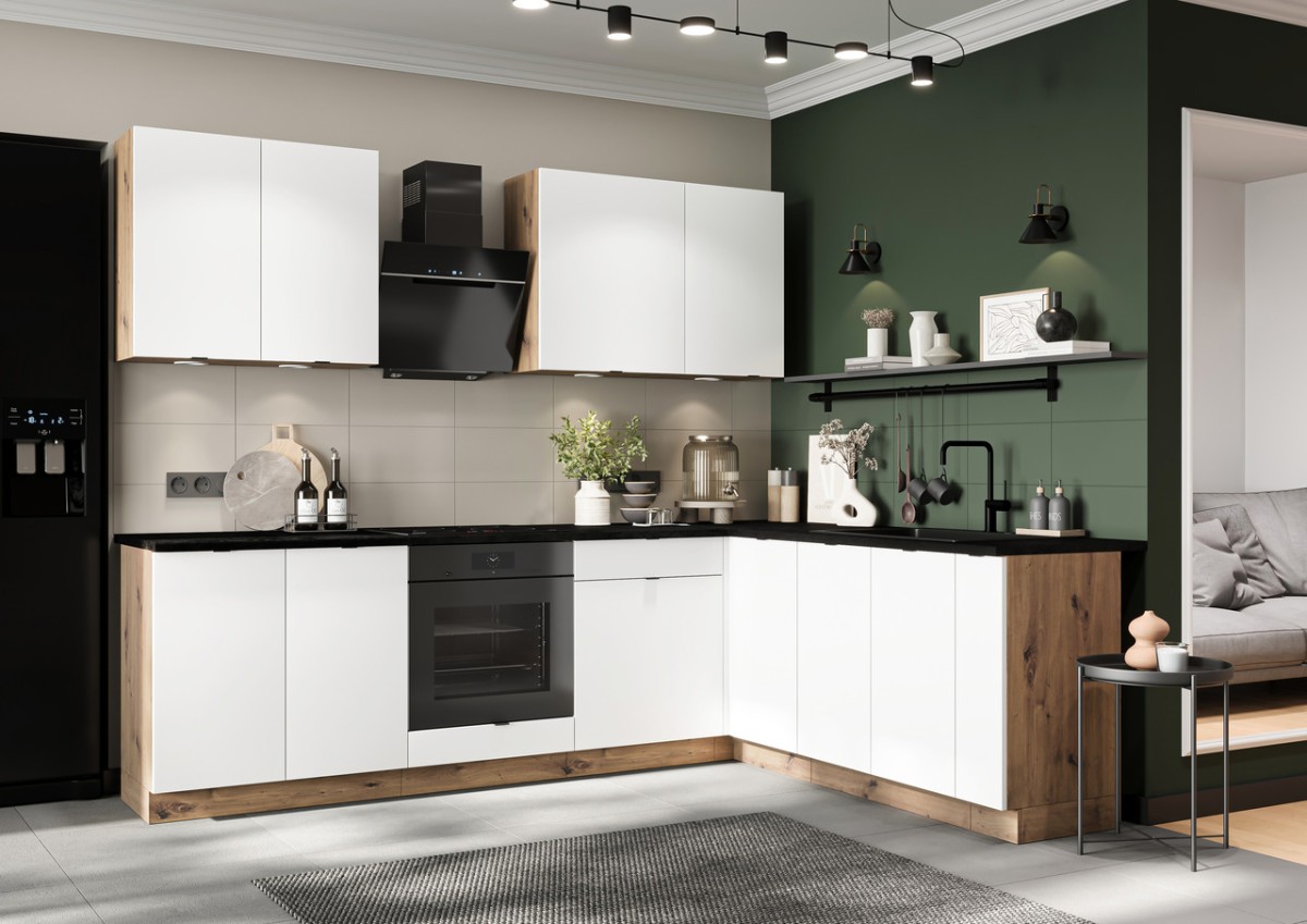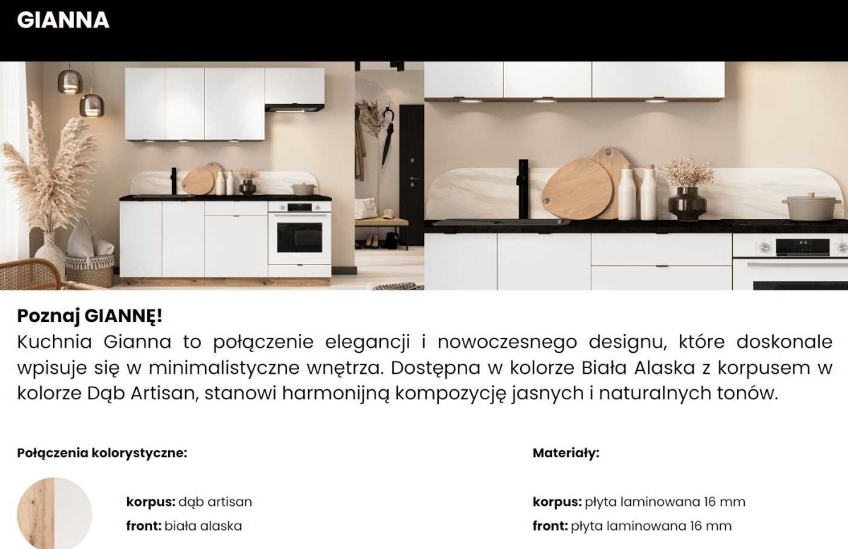 „Gianna“ virtuvėje dera elegancija ir modernus dizainas, puikiai papildydama minimalistinį interjerą. Galima rinktis iš Aliaskos baltos spalvos su „Artisan Oak“ korpusu, sukuriant harmoningą šviesių ir natūralių atspalvių kompoziciją. Komplektą sudaro spintelės be stalviršių: