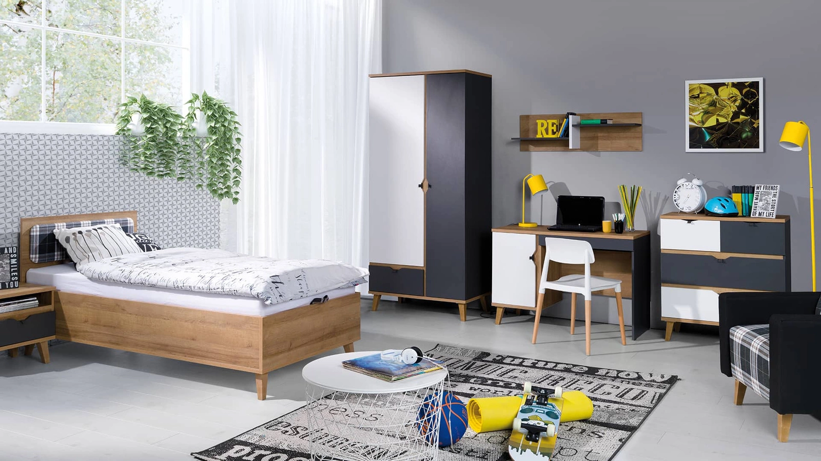 „Memone“ baldų komplektas, auksinis ąžuolas / baltas / grafitas, modernus dizainas, stilingas skandinaviško stiliaus baldų komplektas jaunimo kambariui