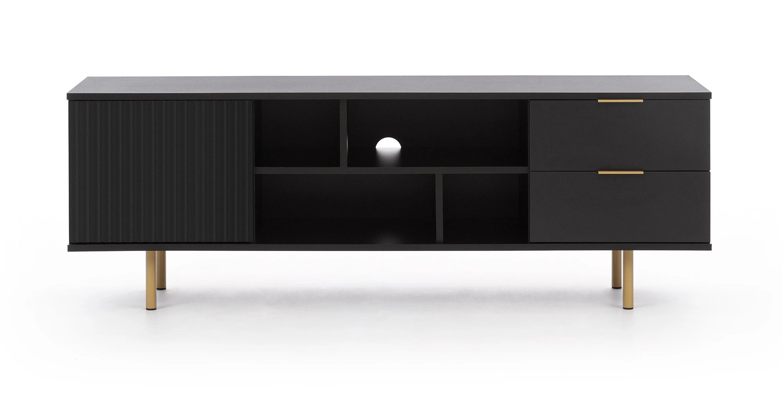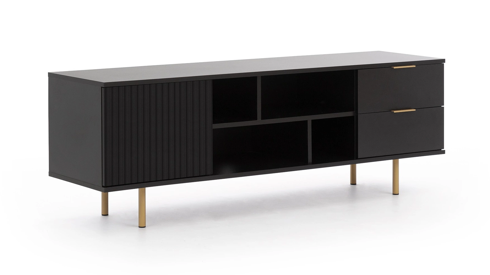Sula baldų komplektas, juodas, svetainės sieninė spintelė, praturtinta metalinėmis rankenomis, dekoratyviniais grioveliais išraižytais fasadais, atidarymo spustelėjus sistema