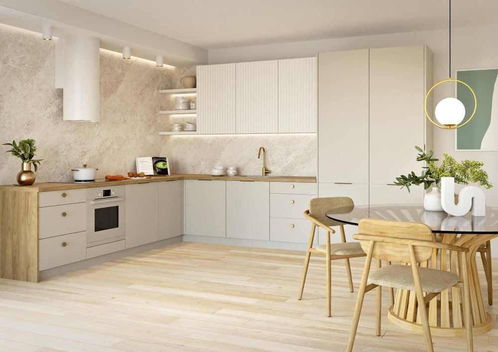 „Tracy“ virtuvė įkvėpta retro stiliaus. Joje yra matiniai, plačiais grioveliais dekoruoti fasadai, pagaminti iš 16 mm storio laminuotos MDF plokštės. Išskirtiniai grioveliai suteikia įdomių detalių vienspalviams paviršiams. Komplektą sudaro: