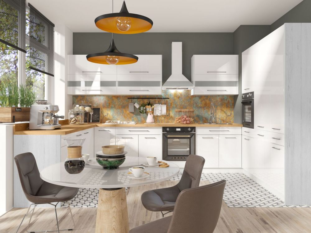 „Creativa“ kampinis virtuvės komplektas 240–280 cm, baltas blizgus