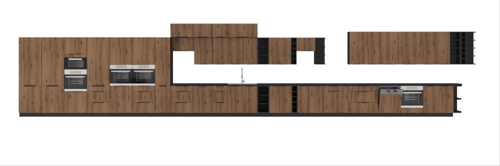 Priekinės dalys: 16 mm laminuota plokštė, matinė juoda (ABS) ir Okapi riešutmedis
