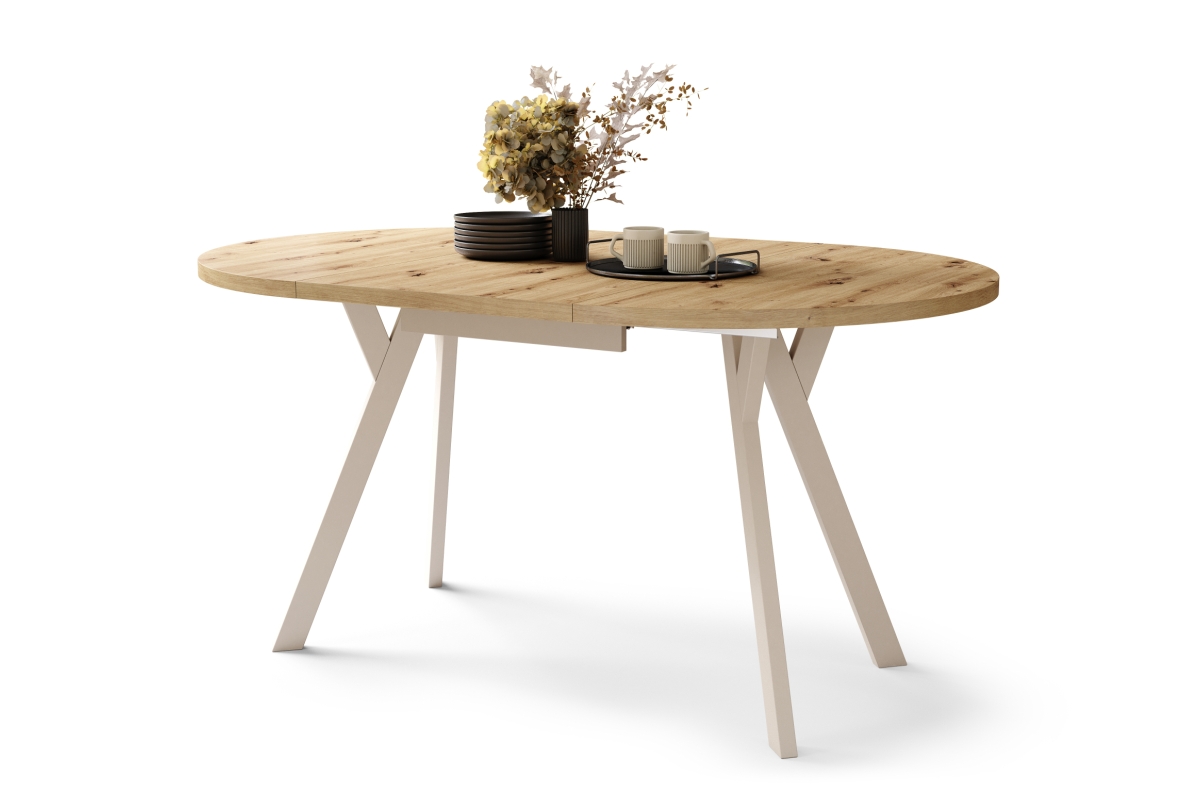 KOMPLEKTAS: ALDO Artisan ąžuolinis stalas su smėlio spalvos kojomis – apvalus, ištraukiamas, ir 4 ALTEA smėlio spalvos kėdės su natūralaus ąžuolo kojomis – apmuštos