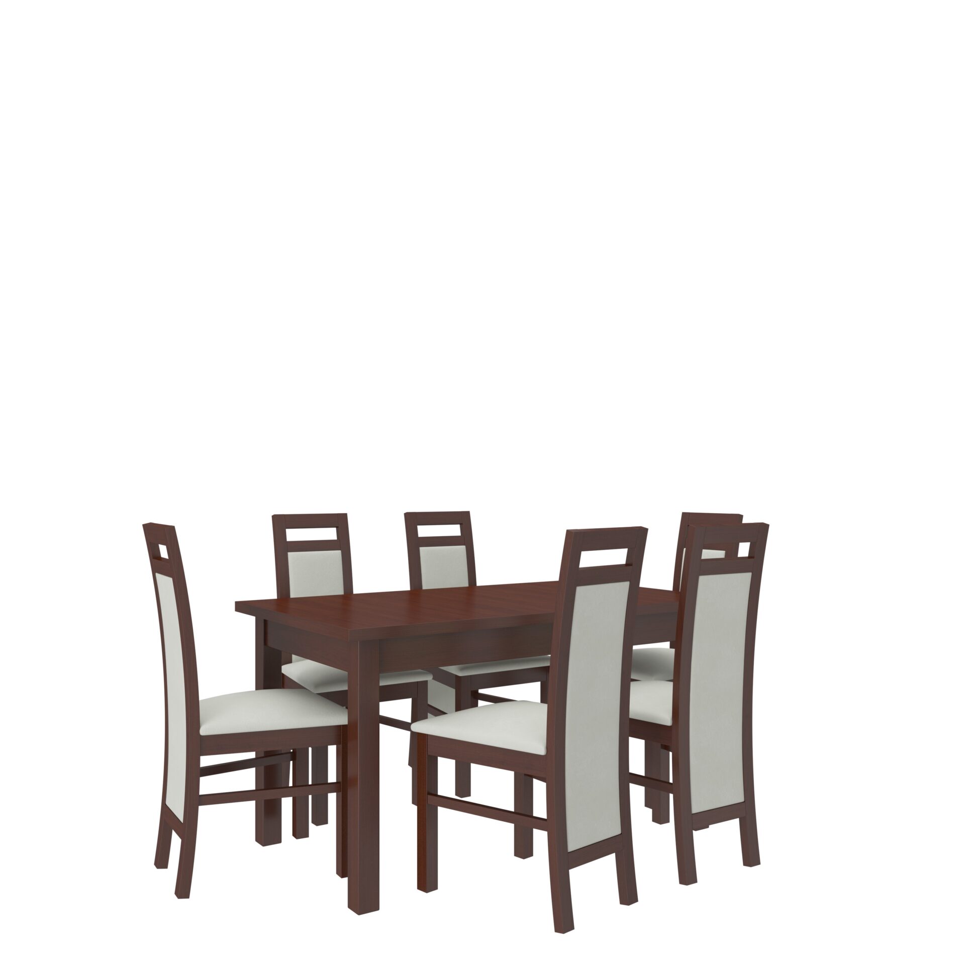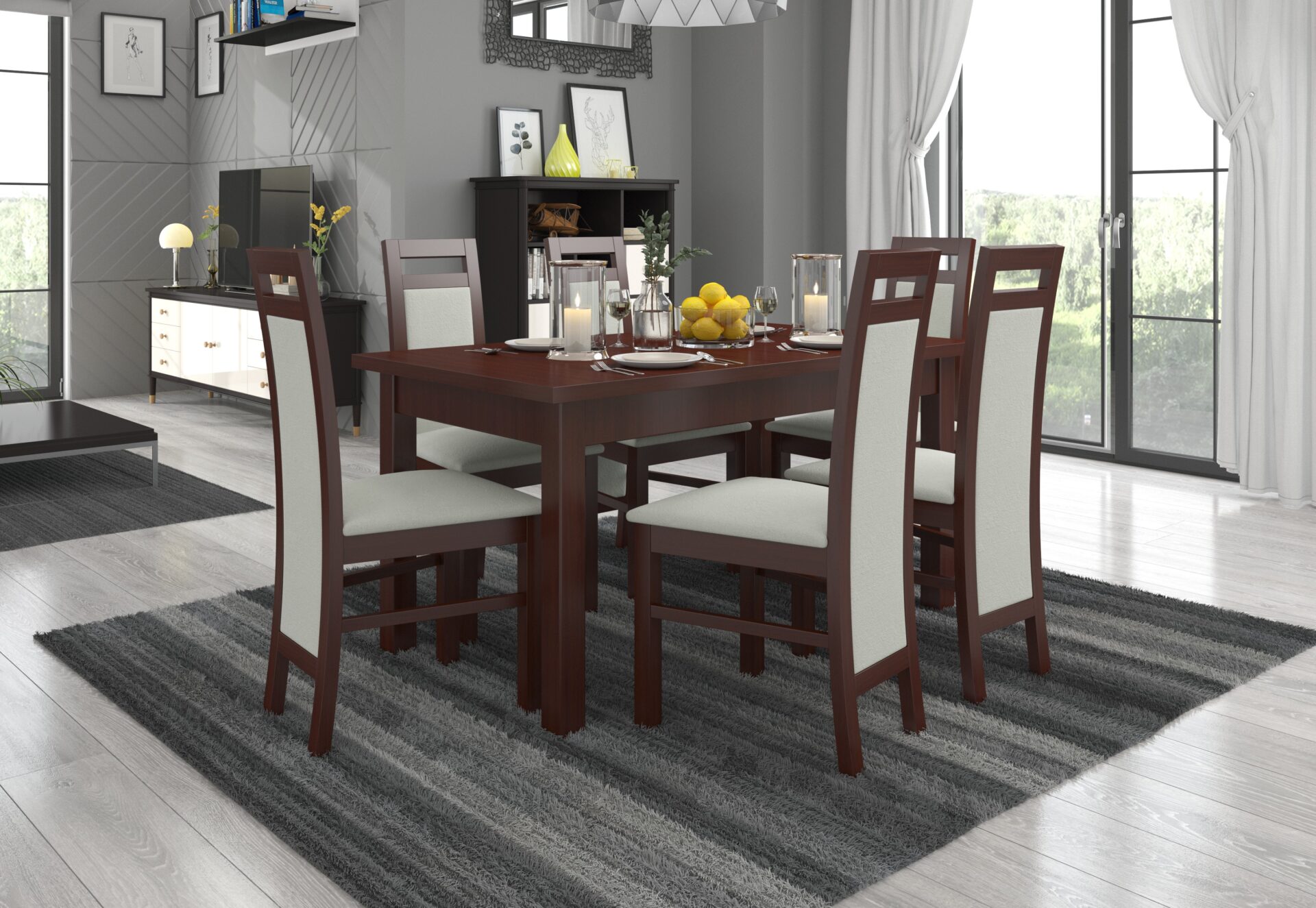 RODOS 14 komplektas – puikus sprendimas klasikiniam valgomajam. Komplektą sudaro tvirtas stalas ir šešios patogios kėdės. Prie paprasto stalo patogiai telpa šeši žmonės. Baldai yra elegantiški ir patogūs. Išsirinkite norimą spalvų ir audinių kolekciją ir susikurkite savo svajonių komplektą.