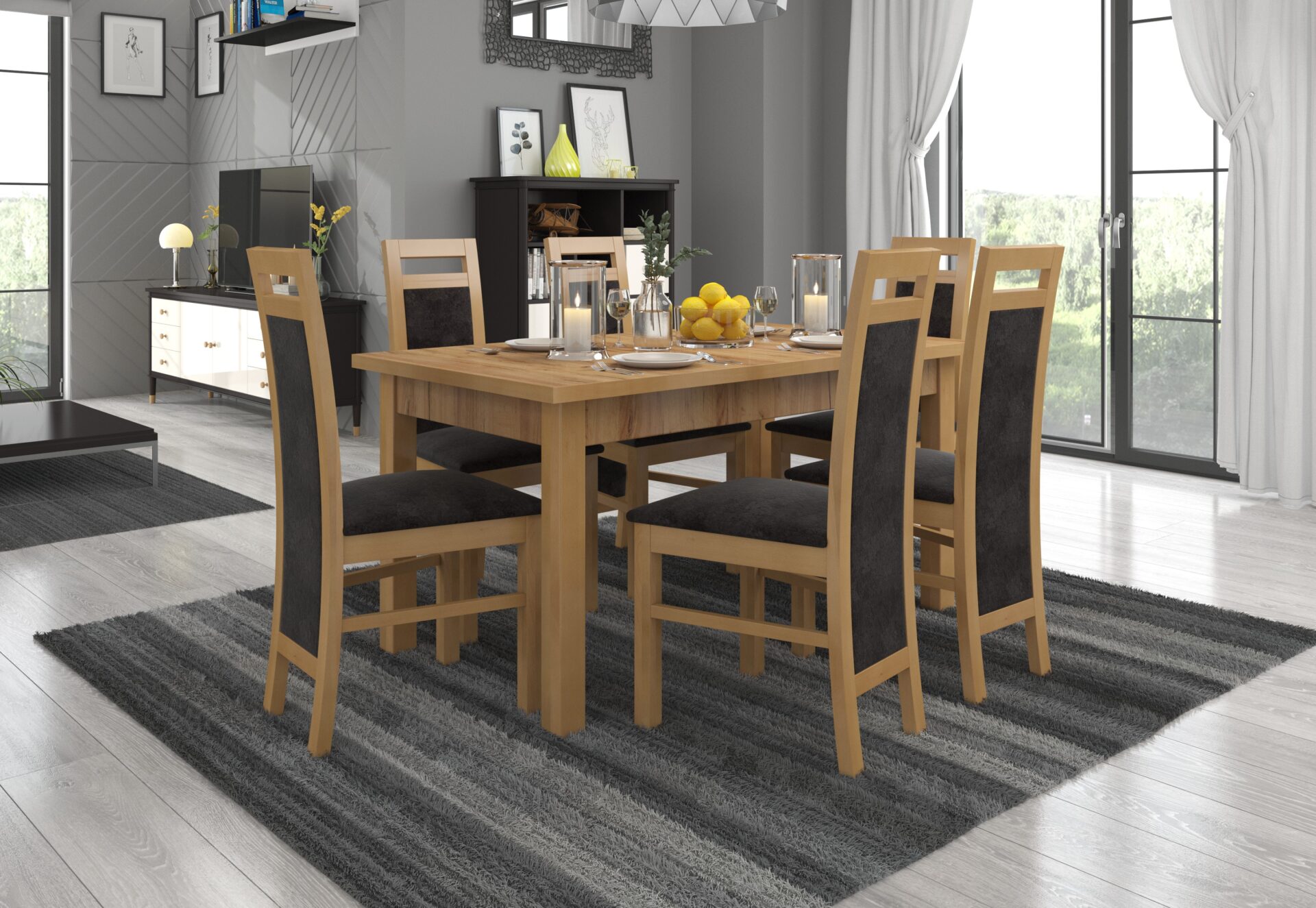 RODOS 14 komplektas – puikus sprendimas klasikiniam valgomajam. Komplektą sudaro tvirtas stalas ir šešios patogios kėdės. Prie paprasto stalo patogiai telpa šeši žmonės. Baldai yra elegantiški ir patogūs. Išsirinkite norimą spalvų ir audinių kolekciją ir susikurkite savo svajonių komplektą.