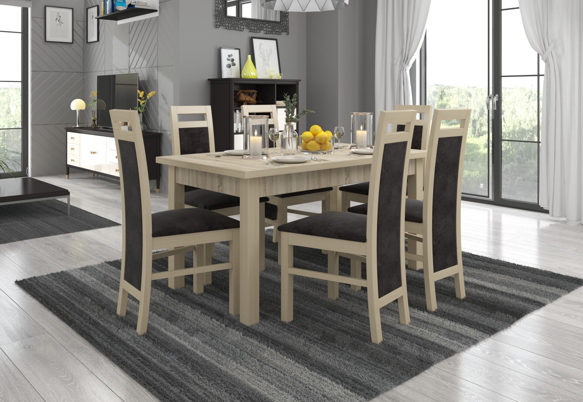 RODOS 14 komplektas – puikus sprendimas klasikiniam valgomajam. Komplektą sudaro tvirtas stalas ir šešios patogios kėdės. Prie paprasto stalo patogiai telpa šeši žmonės. Baldai yra elegantiški ir patogūs. Išsirinkite norimą spalvų ir audinių kolekciją ir susikurkite savo svajonių komplektą.