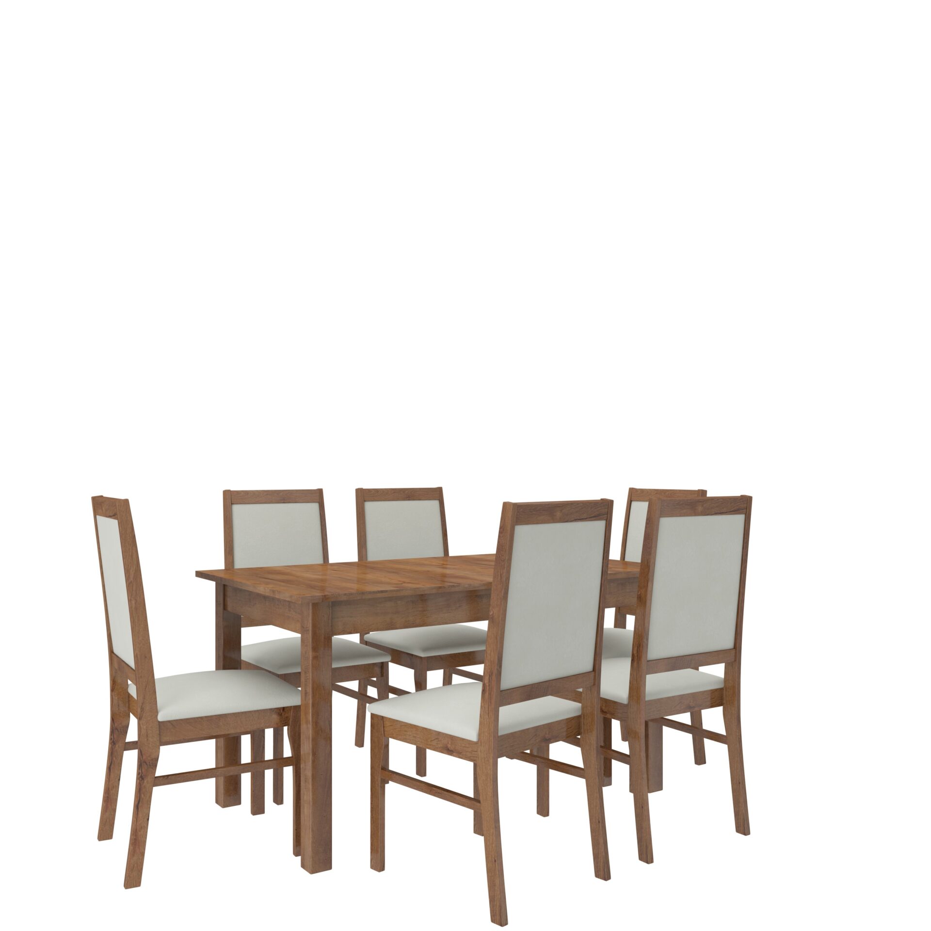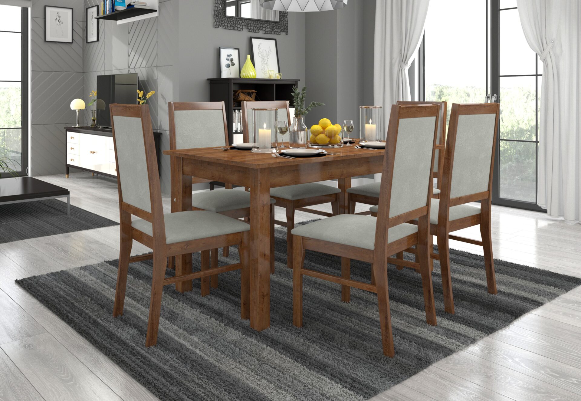 RODOS 25 komplektas – puikus sprendimas klasikiniam valgomajam. Komplektą sudaro tvirtas stalas ir šešios patogios kėdės. Prie paprasto stalo patogiai telpa šeši žmonės. Baldai yra elegantiški ir patogūs. Išsirinkite norimą spalvų ir audinių kolekciją ir susikurkite savo svajonių komplektą.