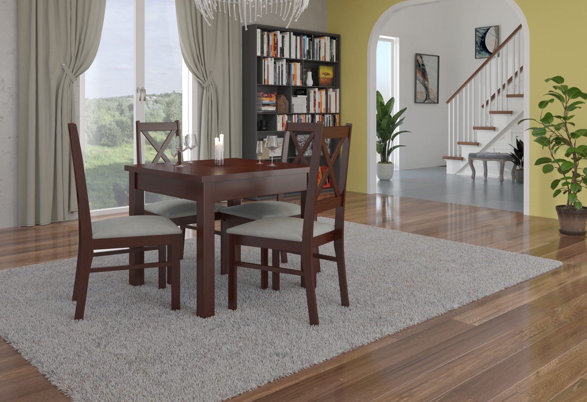 RODOS 38 komplektas – puikus sprendimas klasikiniam, mažam valgomajam. Komplektą sudaro tvirtas stalas ir keturios patogios kėdės. Paprastos formos ir kvadratinio stalviršio stalas patogiai susės keturiems žmonėms. Baldai yra elegantiški ir patogūs. Išsirinkite norimą spalvų ir audinių kolekciją ir susikurkite savo svajonių komplektą.