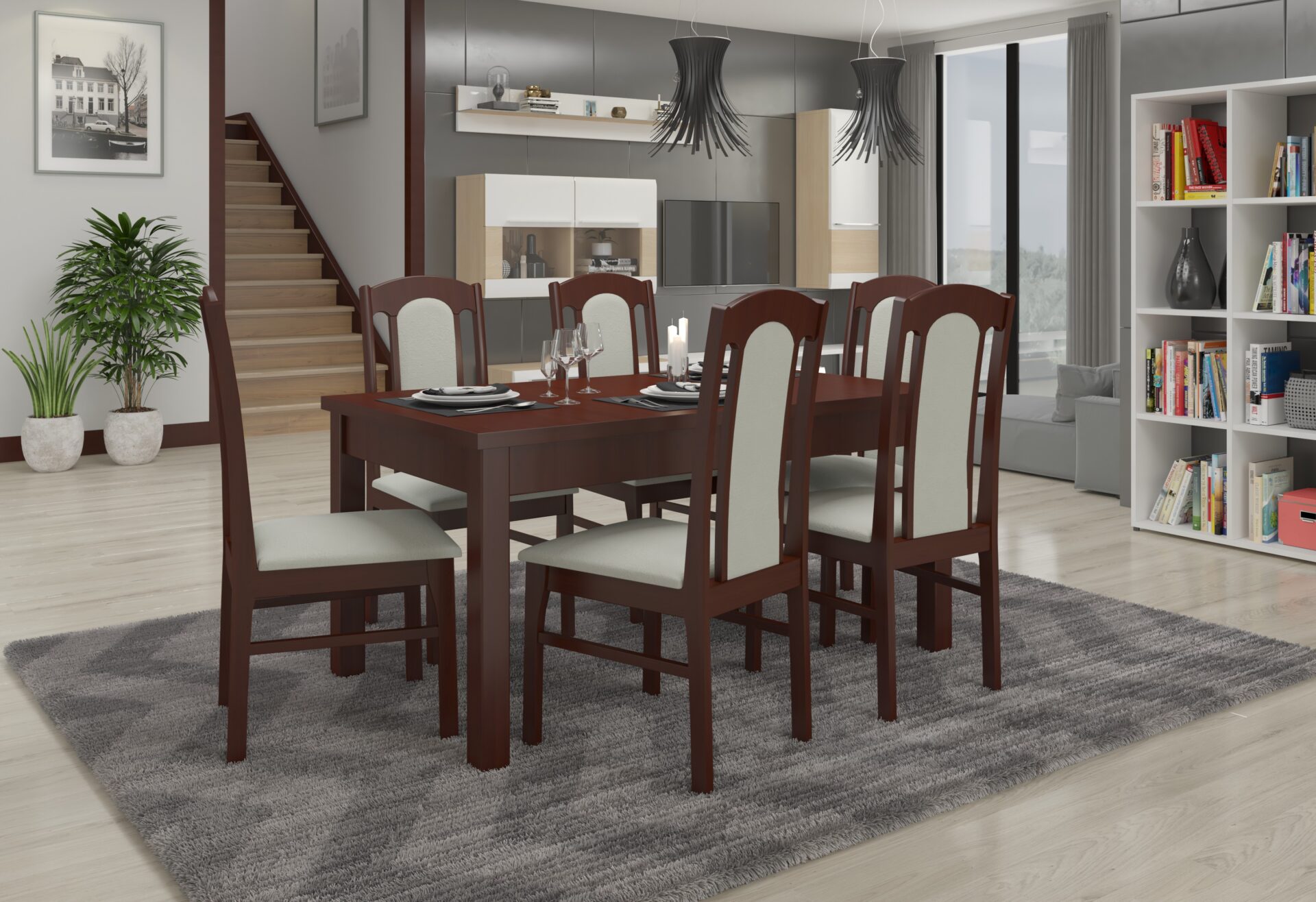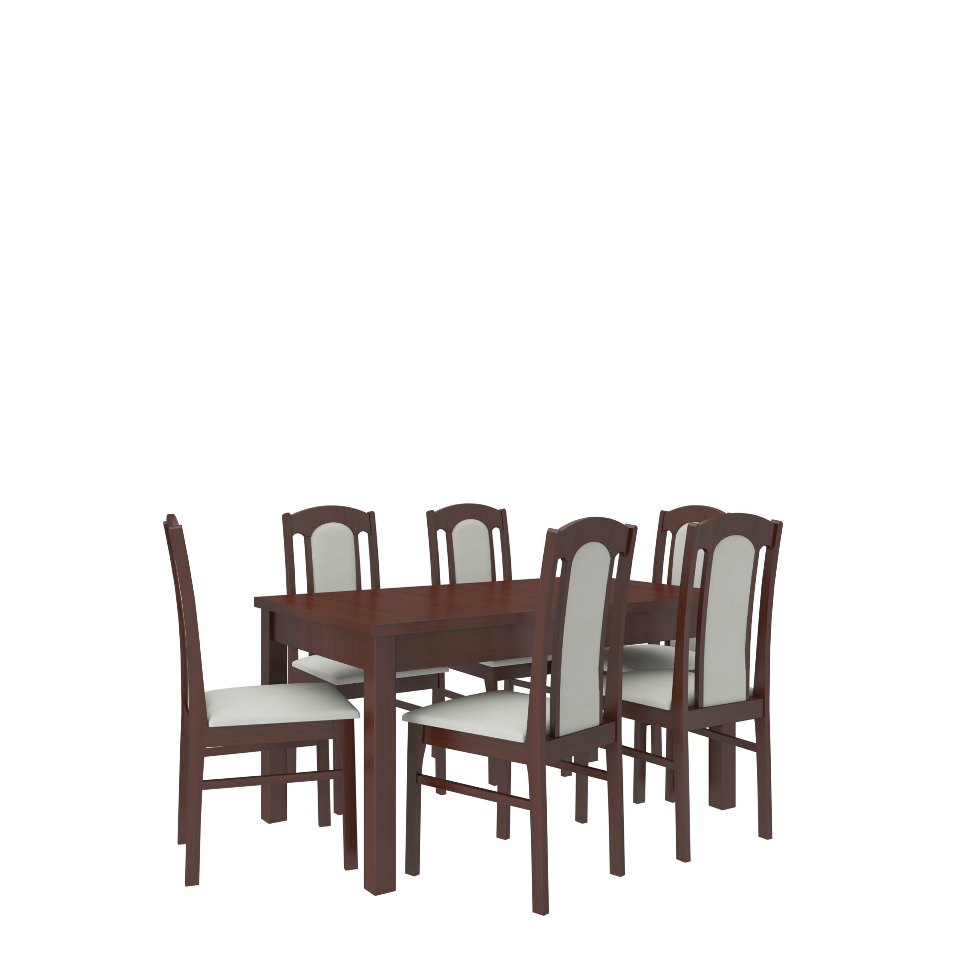 RODOS 53 komplektas – puikus sprendimas klasikiniam valgomajam. Komplektą sudaro tvirtas stalas ir šešios patogios kėdės. Prie paprasto stalo patogiai telpa šeši žmonės. Baldai yra elegantiški ir patogūs. Išsirinkite norimą spalvų ir audinių kolekciją ir susikurkite savo svajonių komplektą.
