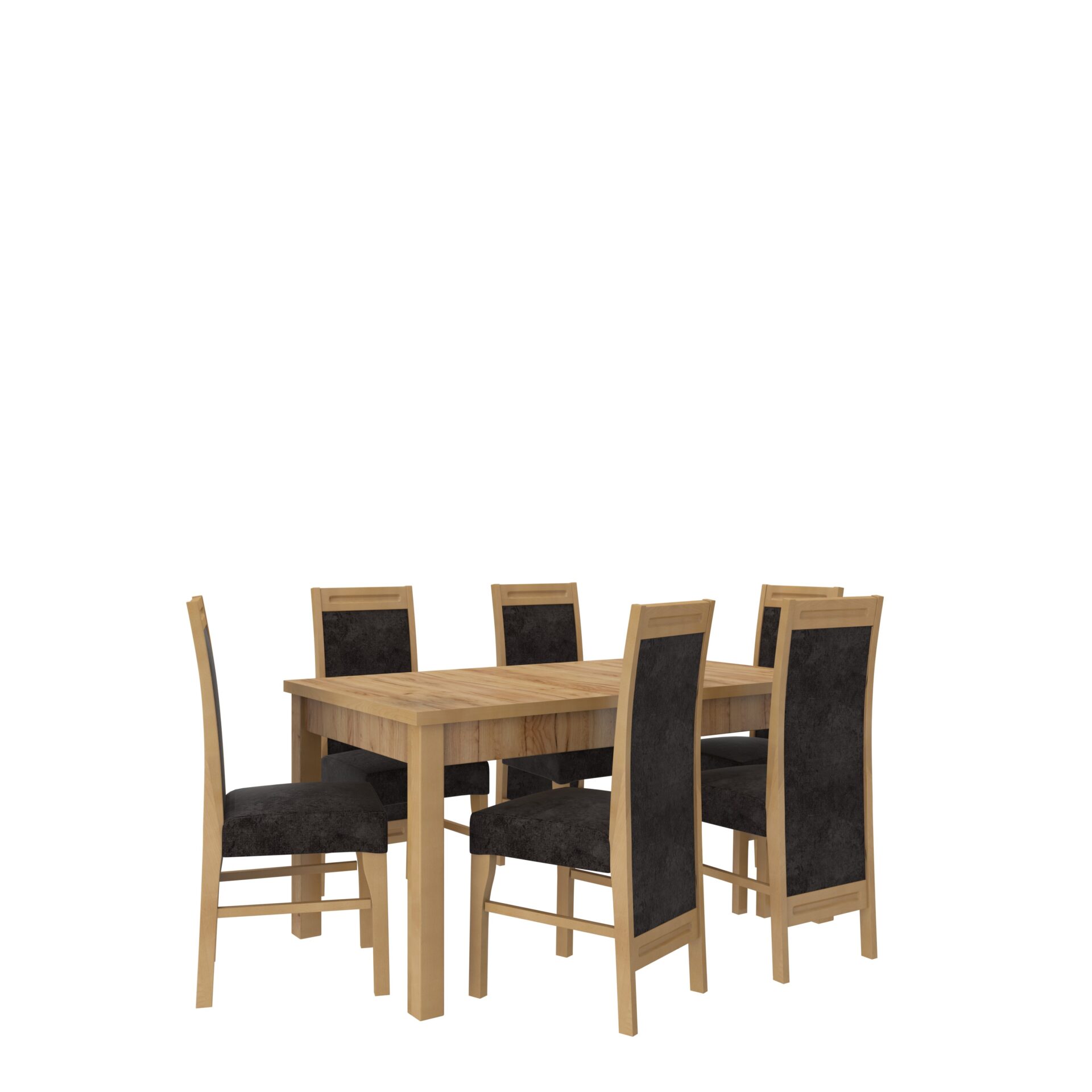 RODOS 57 komplektas – puikus sprendimas klasikiniam valgomajam. Komplektą sudaro tvirtas stalas ir šešios patogios kėdės. Prie paprasto stalo patogiai telpa šeši žmonės. Baldai yra elegantiški ir patogūs. Išsirinkite norimą spalvų ir audinių kolekciją ir susikurkite savo svajonių komplektą.