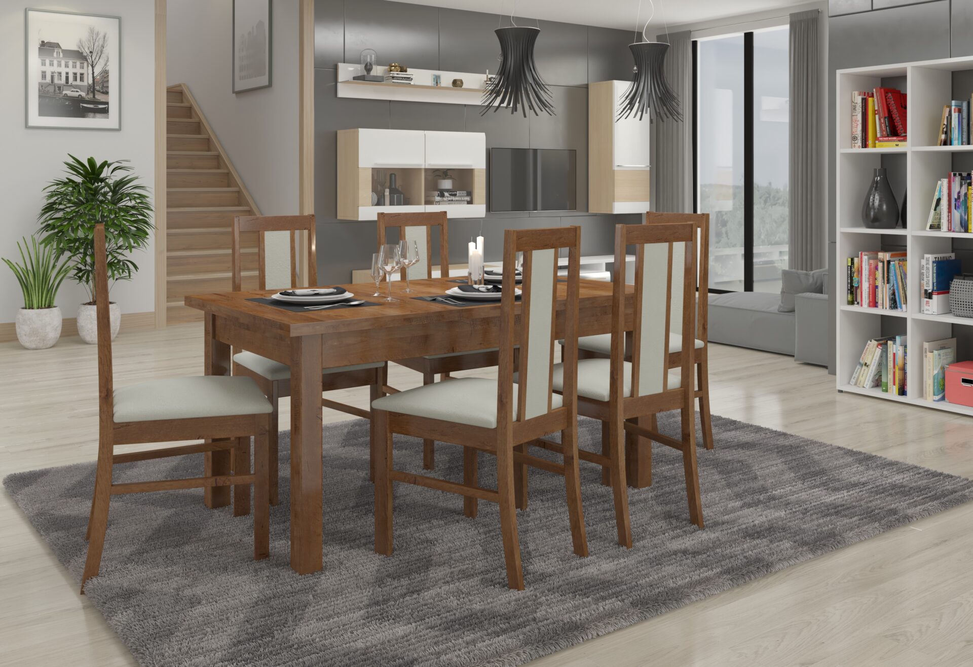RODOS 59 komplektas – puikus sprendimas klasikiniam valgomajam. Komplektą sudaro tvirtas stalas ir šešios patogios kėdės. Prie paprasto stalo patogiai telpa šeši žmonės. Baldai yra elegantiški ir patogūs. Išsirinkite norimą spalvų ir audinių kolekciją ir susikurkite savo svajonių komplektą.