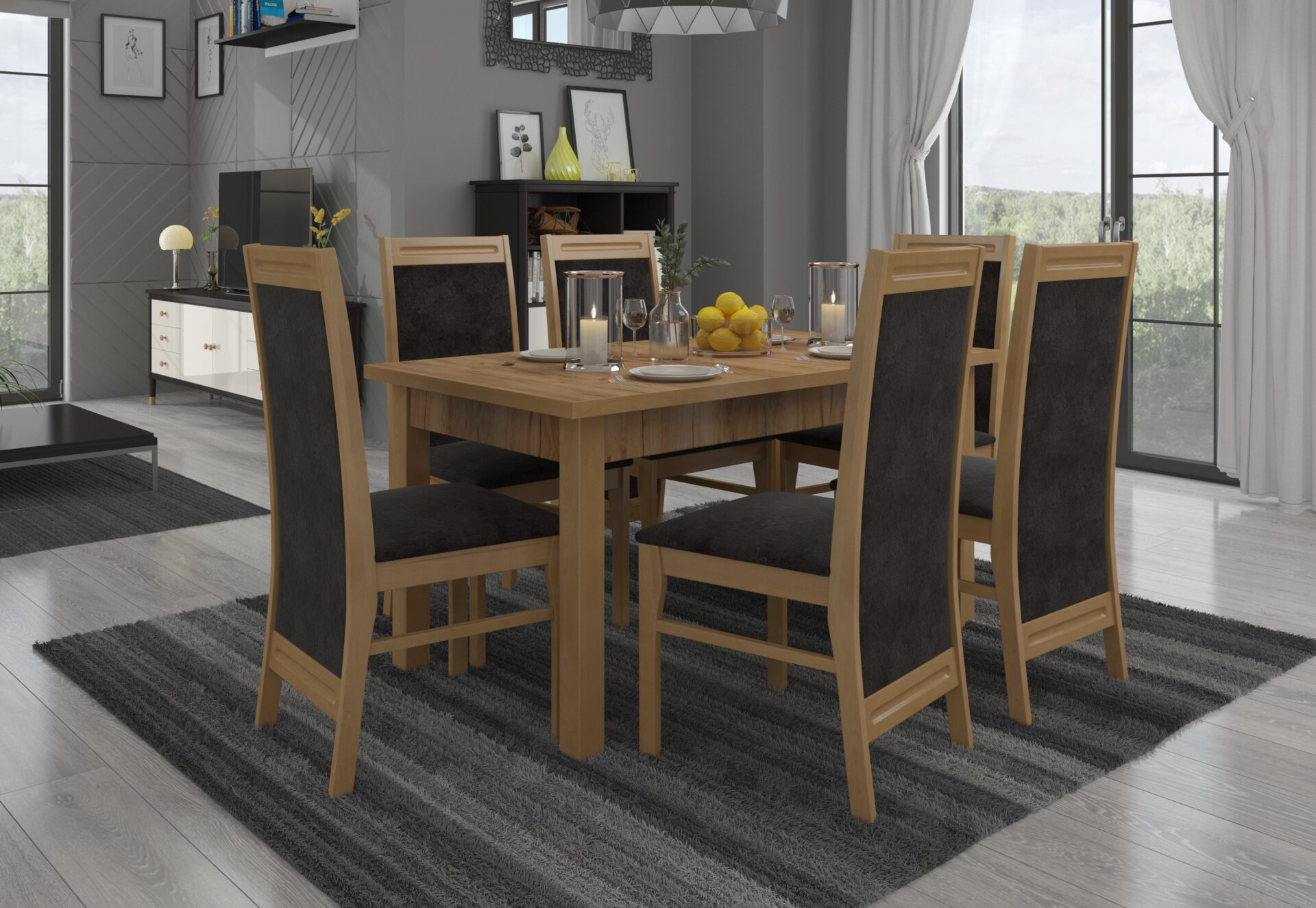 RODOS 7 dalių baldų komplektas – puikus sprendimas klasikiniam valgomajam. Komplektą sudaro tvirtas stalas ir šešios patogios kėdės. Prie paprasto stalo patogiai telpa šeši žmonės. Baldai yra elegantiški ir patogūs. Išsirinkite norimą spalvų ir audinių kolekciją ir susikurkite savo svajonių baldų komplektą.