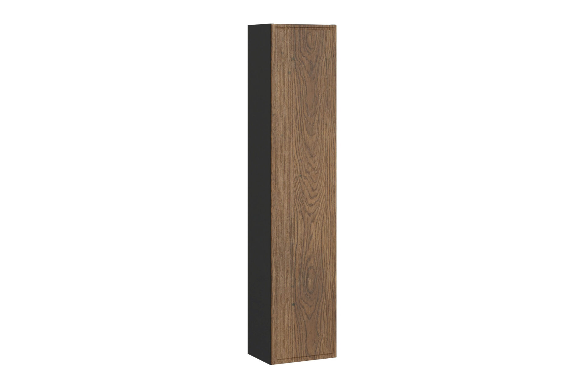 Vienų durų aukšta spintelė iš tos pačios kolekcijos yra įspūdingo 140 cm aukščio ir turi keturias erdvias lentynas, kurios padės sutvarkyti vonios kambario erdvę. Paspaudus atidarymo sistema leidžia lengvai atidaryti duris vienu lengvu judesiu, todėl nereikia tradicinių rankenų. Švelnaus uždarymo sistema padidina komfortą, todėl naudotis šiuo baldu yra tikras malonumas.