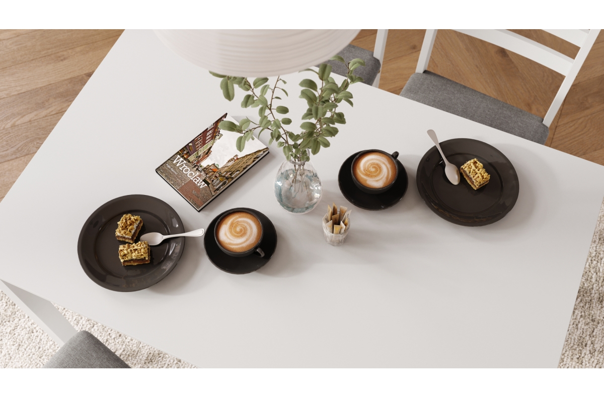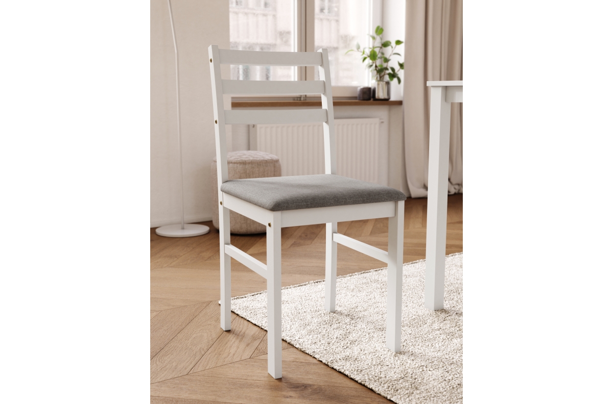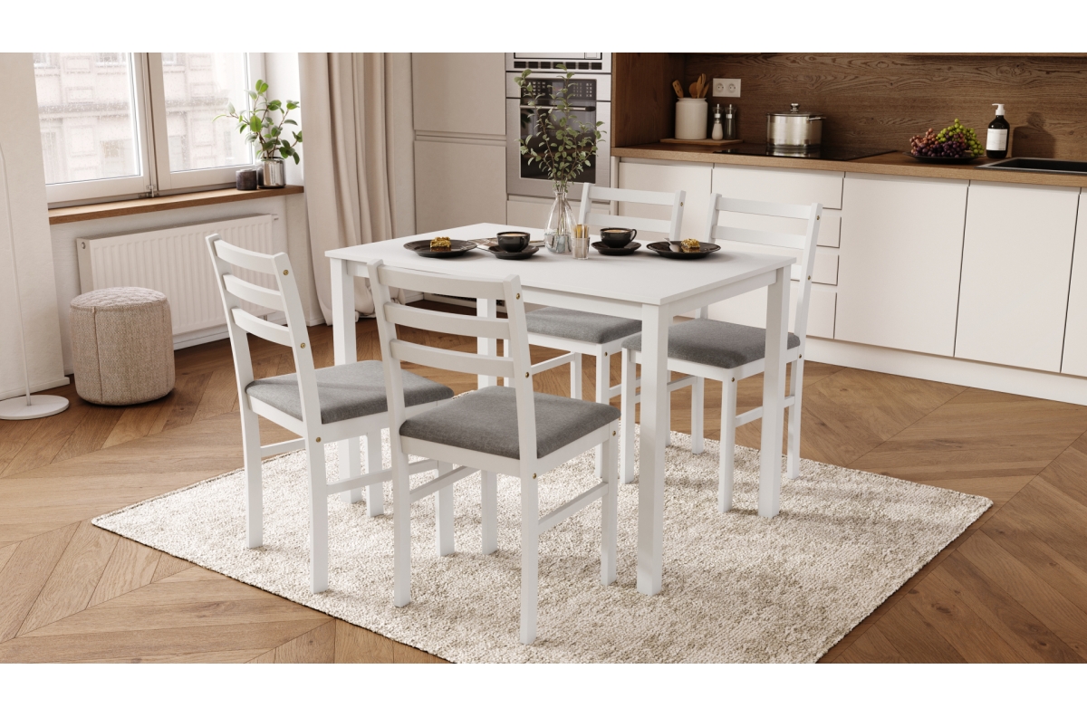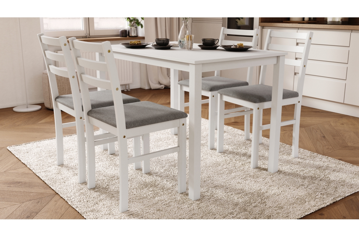 TORINO stalas + 4 kėdės, baltas/šviesiai pilkas komplektas (audinys „Sawana 21“) – MEDINIS VIRTUVĖS/VALGOMOJO KOMPLEKTAS