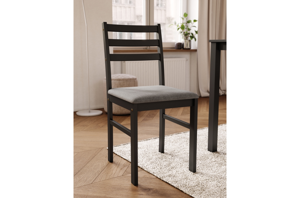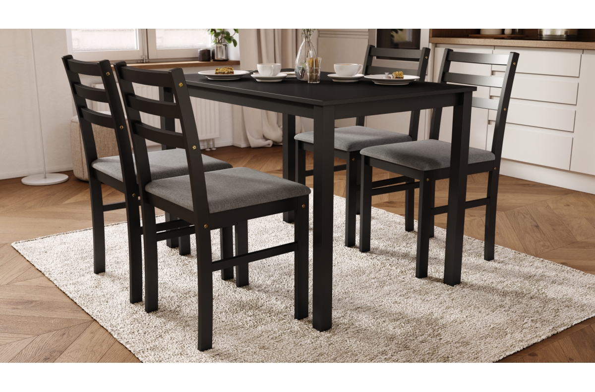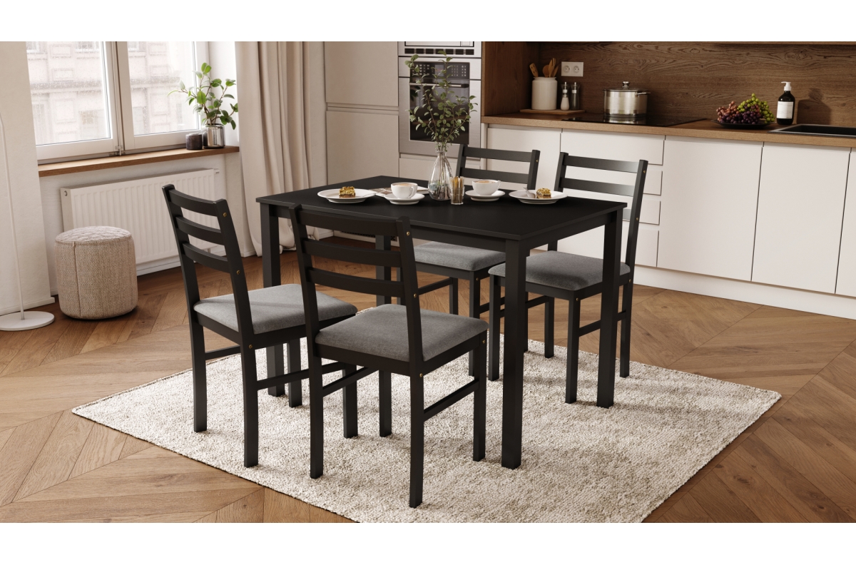 TORINO stalas + 4 kėdės, juodas/šviesiai pilkas komplektas (audinys „Sawana 21“) – MEDINIS VIRTUVĖS/VALGOMOJO BALDŲ KOMPLEKTAS