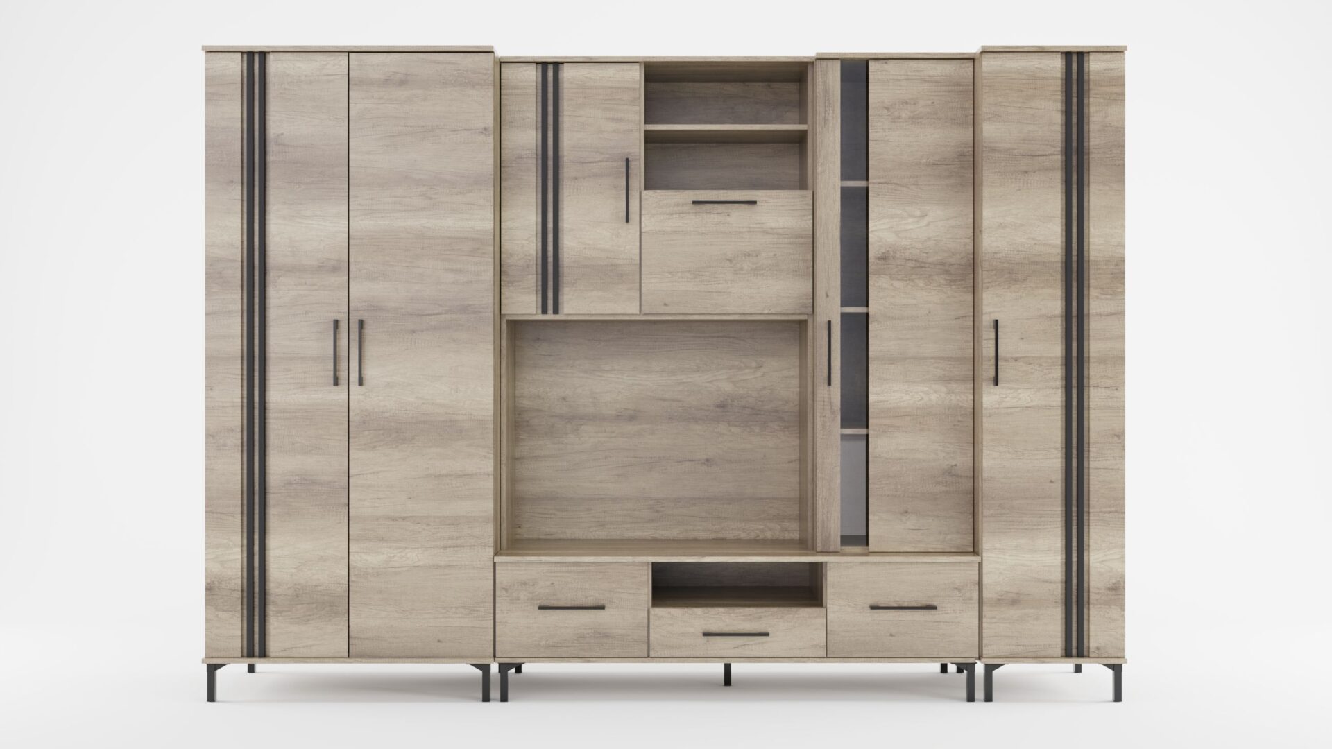 – Vizualizacijoje parodyta sieninė spintelė yra apdailinta „Wotan“ / juodomis lentjuostėmis.