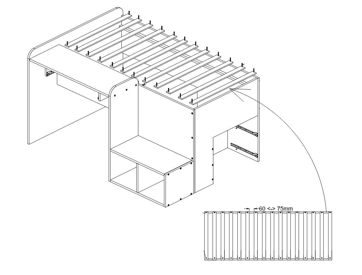 Modernus dizainas ir dizaino paprastumas leidžia lovai derėti prie bet kokio interjero. Konstrukcijai buvo naudojama pušies mediena su laminuota lenta. Konstrukciniai elementai buvo pagaminti iš kruopščiai atrinktos pušies medienos. Gamintojai sutelkė dėmesį ne tik į modernumą, bet ir į funkcionalumą, į konstrukciją įmontuodami lentyną, todėl lova yra patvaresnė ir praktiškesnė.