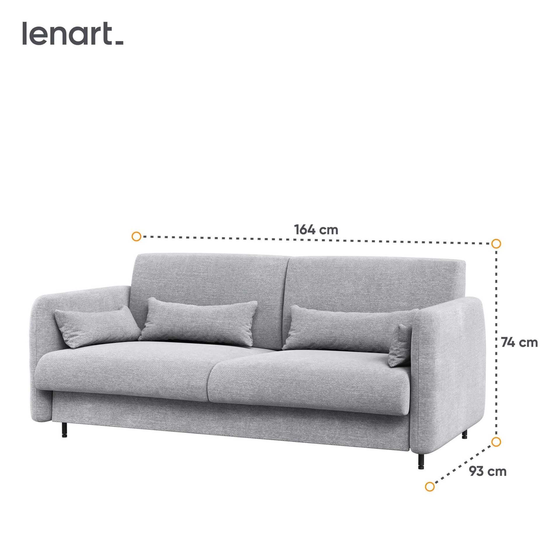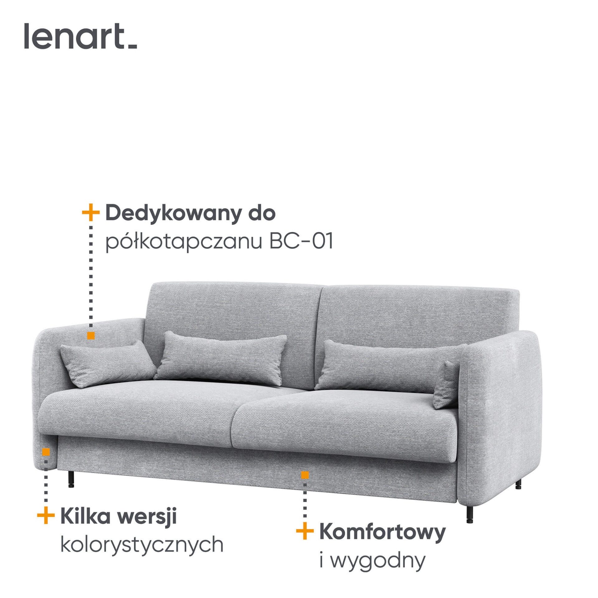 „Lenart BED CONCEPT BC-18“ – tai sofa, sukurta prie BC-01 prie sienos tvirtinamos lovos, kurioje telpa 140 cm čiužinys. „Lenart“ sukūrė šį modelį, siekdamas užtikrinti komfortą ir kartu pagerinti jūsų interjero estetiką. Pilko audinio ART 82626 sofa BC-18 su baltu priekiu yra universalus sprendimas, puikiai tinkantis tiek moderniame, tiek klasikiniame interjere. „BED CONCEPT“ sistema leidžia per akimirką paversti svetainę pilnaverčiu miegamuoju. Dieną sofa yra jauki vieta susirinkti ir atsipalaiduoti, o vakare ji virsta patogia lova. Šis variantas skirtas tiems, kurie nori maksimaliai išnaudoti erdvę mažame bute neprarandant komforto ir stiliaus.