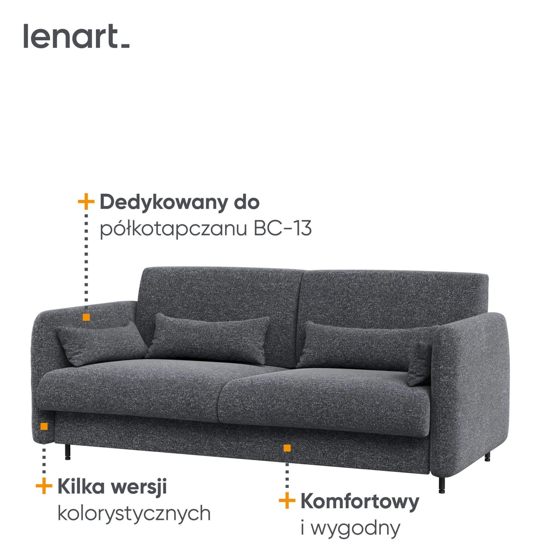 „Lenart BED CONCEPT BC-35“ sofa 180 cm, skirta BC-13, yra moderni sieninė lova, puikiai tinkanti mažiems butams ir studijos tipo apartamentams. „Lenart“ sukūrė praktišką sprendimą, kuris leis per kelias sekundes paversti jūsų svetainę pilno dydžio miegamuoju. Sieninė lova su sofa – tai baldas, kuriame derinamas funkcionalumas, patogumas ir elegantiškas dizainas. „BED CONCEPT BC-35“ modelis su atitinkančia pilka sofa BC-13 yra paprastumo ir stiliaus derinys. Grafito spalvos sofa, aptraukta ART-82630 audiniu, puikiai papildo neutralią pilką fasadą. Dieną komplektas tarnauja kaip patogi sofa, o vakare lengvai transformuojasi į patogią lovą, užtikrindamas ramų nakties miegą. Šis sprendimas taupo vietą ir tuo pačiu suteikia interjerui modernumo bei jaukumo.