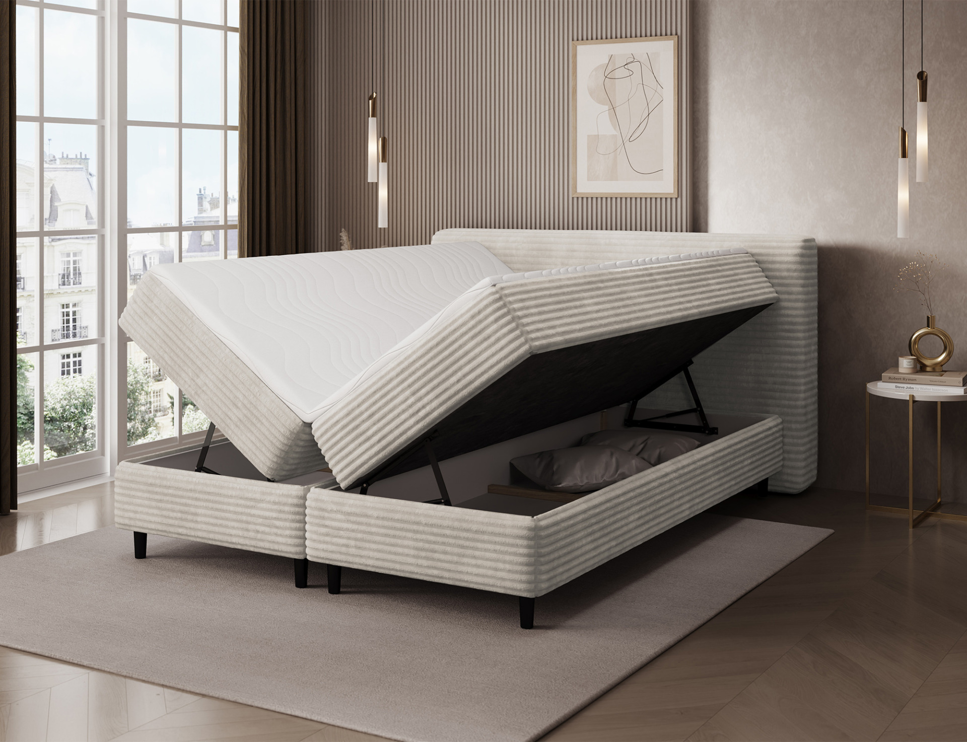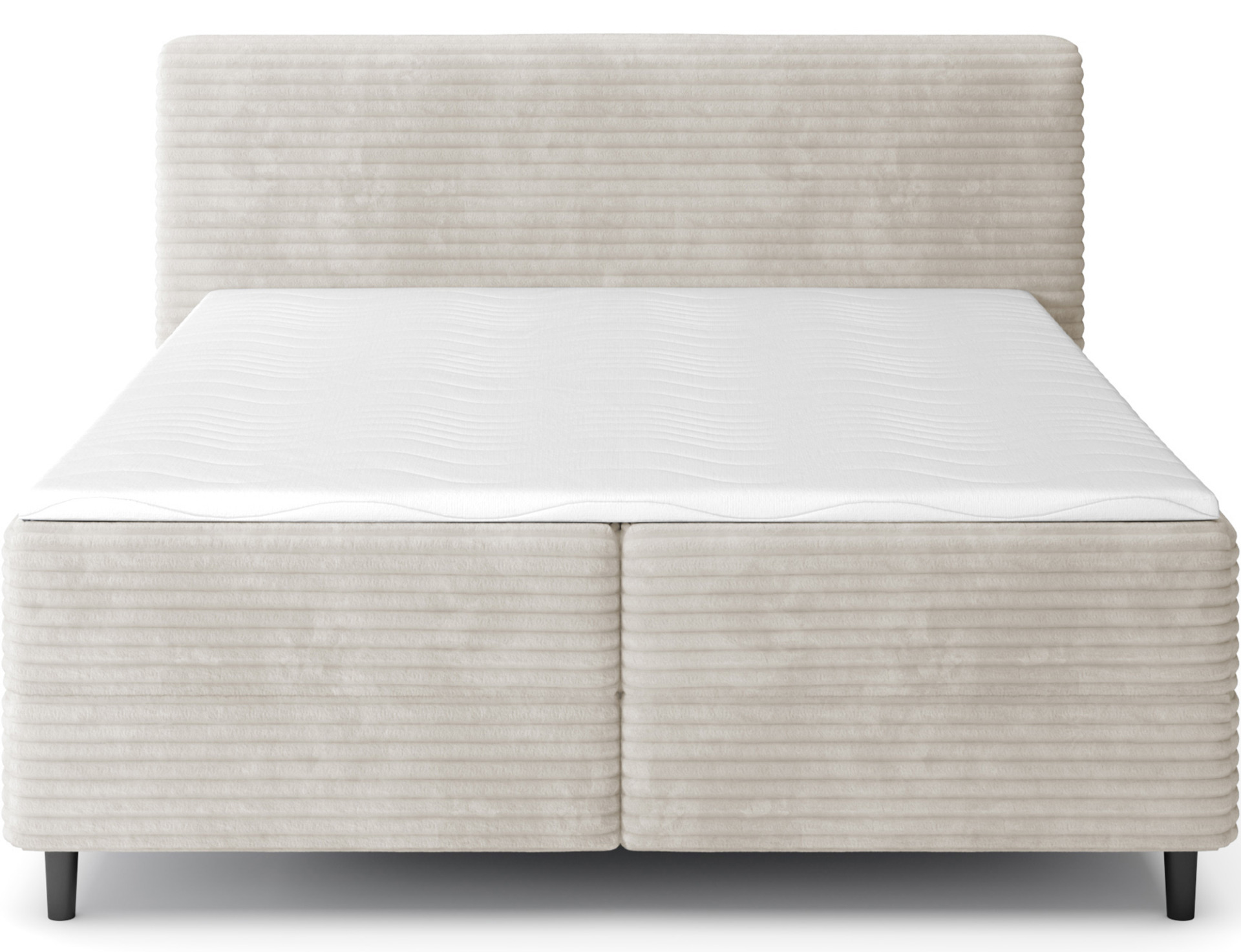 „Cortiko“ kontinentinė lova – elegantiškas ir patogus pasirinkimas modernaus stiliaus mėgėjams. Galima rinktis iš trijų dydžių: 140 × 200 cm, 160 × 200 cm ir 180 × 200 cm, todėl plotį galima idealiai pritaikyti prie naudotojo poreikių – atitinkamai 162 cm, 182 cm arba 202 cm. Bendras lovos aukštis – 102 cm, o gylis – 222 cm, todėl konstrukcija atrodo stabiliai ir proporcingai. Lovos vidus pagamintas iš „bonell“ spyruoklių ir T2540 putplasčio derinio, užtikrinančio puikią kūno atramą ir aukštą miego komforto lygį. „Cortiko“ modelyje yra praktiška patalynės dėžė, leidžianti palaikyti tvarką miegamajame ir maksimaliai išnaudoti erdvę. Juodos medinės baldų kojelės papildo dizainą, suteikdamos elegancijos ir lengvumo. Modernus „Cortiko“ lovos dizainas puikiai tinka tiek minimalistiniam, tiek išraiškingesniam interjerui, suteikdamas bet kuriam miegamajam stilingą ir funkcionalų elementą.