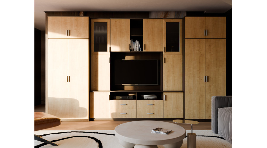 390 x 232 cm dydžio SAWA sieninė spinta buvo suprojektuota kaip erdvi sieninė spinta, kurioje sujungtos erdvios spintos su aiškiai atskirta multimedijos zona. Toks išplanavimas leidžia visapusiškai išnaudoti didelę sienos erdvę, sujungiant daiktų laikymo, eksponavimo ir televizoriaus funkcijas viename darniame vienete.