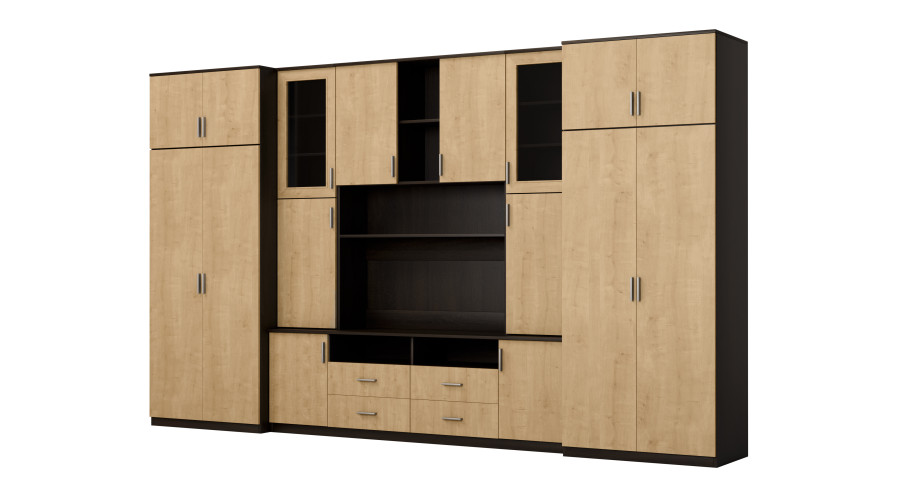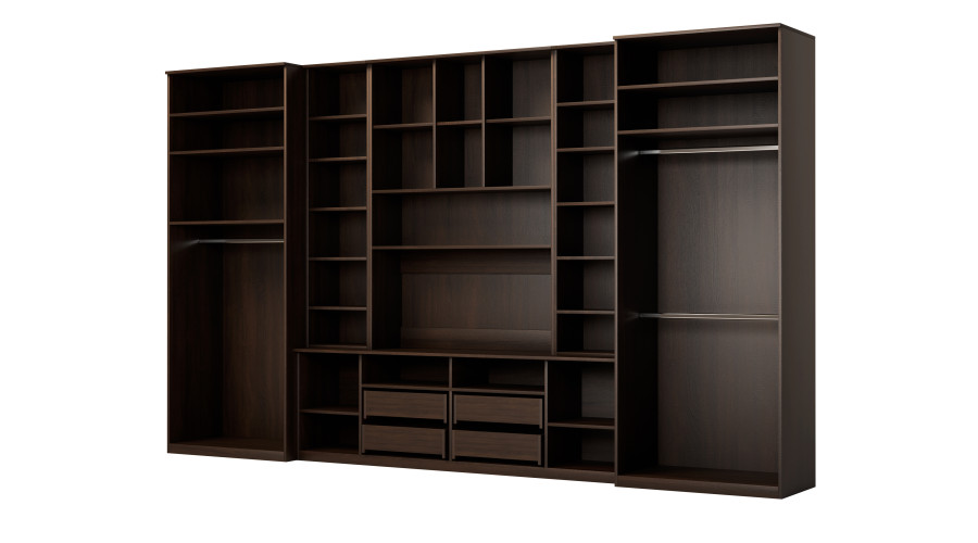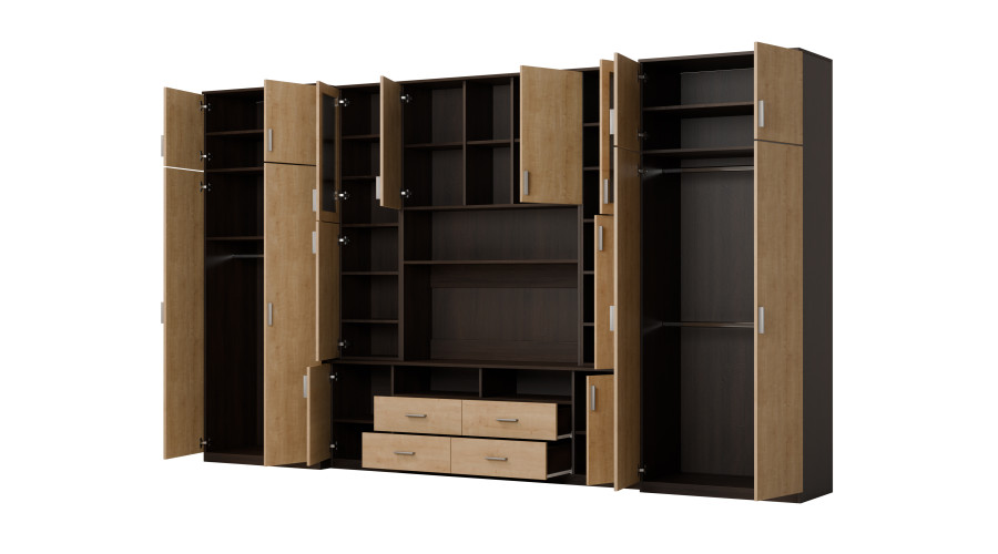 Spintelę sudaro dvi labai erdvios spintos su pakabomis ir lentynomis, taip pat papildomi moduliai drabužiams, tekstilei ir aksesuarams susidėti. Centrinė sieninės spintelės dalis suprojektuota kaip funkcionali televizoriaus zona su didele niša televizoriui ir vieta multimedijos įrangai. Apatinėje dalyje esantys stalčiai užtikrina patogų kasdienių daiktų laikymą.