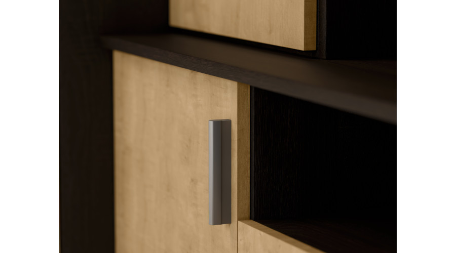 Spintelę papildo rakinamos spintelės ir vitrinos, leidžiančios derinti daiktų laikymą su dekoracijų, knygų ar stalo įrankių eksponavimu. Atviras pasirinktų nišų išdėstymas sutvarko spintelę ir palengvina prieigą prie dažnai naudojamų daiktų, išlaikant darnią ir tvarkingą bendrą išvaizdą. „Dark Sonoma“ ir „Hamilton Oak“ dekoro elementų derinys suteikia šiai sieninei spintelei subalansuotą, elegantišką charakterį. Tamsesnės spalvos ir natūralios medienos rašto derinys sukuria vizualinę harmoniją ir papildo klasikinį ir santūrų interjero dizainą. Kaip ir visas „e-Meblast“ siūlomas sienines spinteles, SAWA modelį galima pritaikyti pagal matmenis, spalvas, elementų išdėstymą ir furnitūrą, todėl galite susikurti komplektą, atitinkantį jūsų individualius poreikius ir kambario dydį.