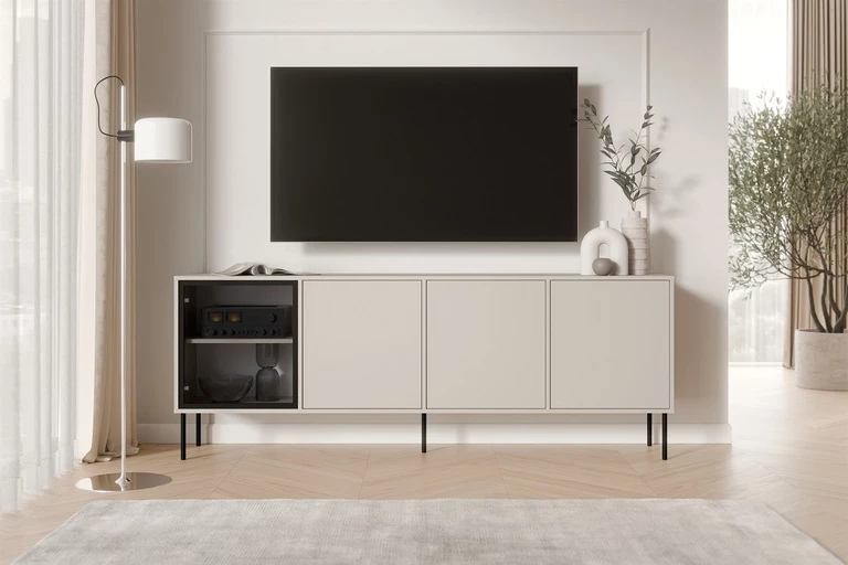 TV 200 3D komoda – elegantiškas ir funkcionalus televizoriaus spintelis, kuriame dera dizainas ir praktiška daiktų laikymo vieta.