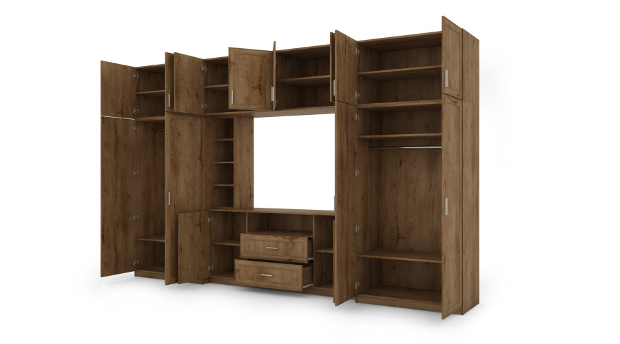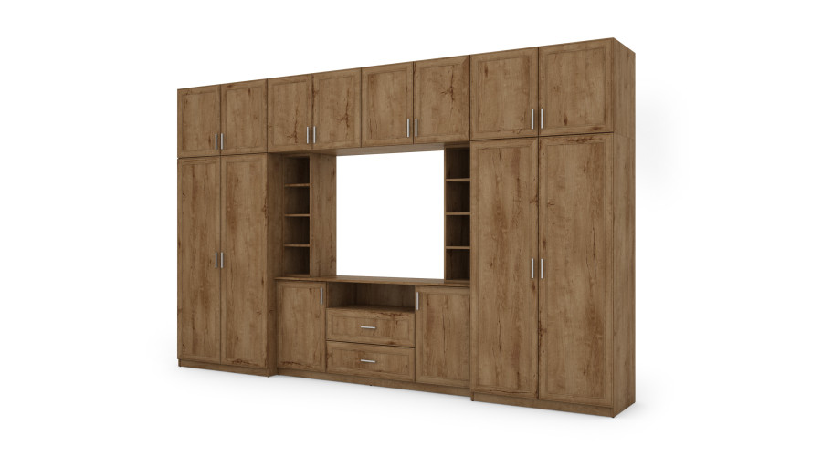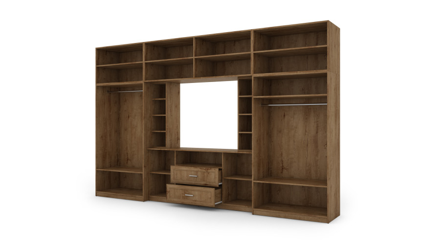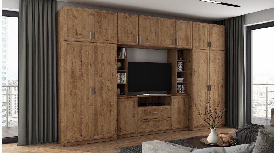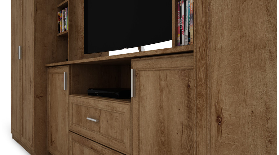 Centrinėje sieninės spintelės dalyje yra televizoriaus zona su lentyna televizoriui ir multimedijos įrangai, skirta kasdieniam naudojimui. Apatinės spintelės ir stalčiai suteikia praktišką vietą televizoriaus priedams, dokumentams ir smulkiems daiktams, padeda palaikyti tvarką svetainėje.