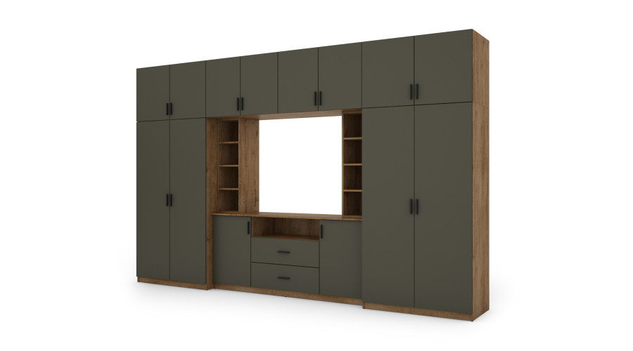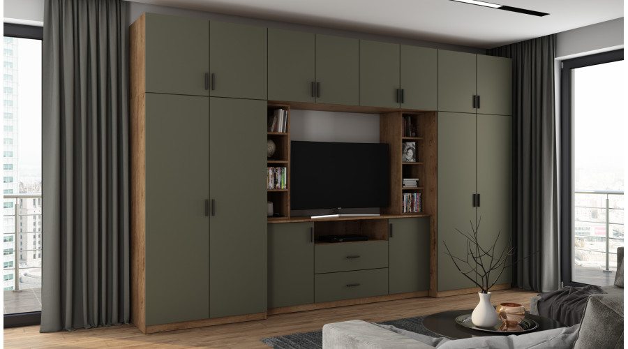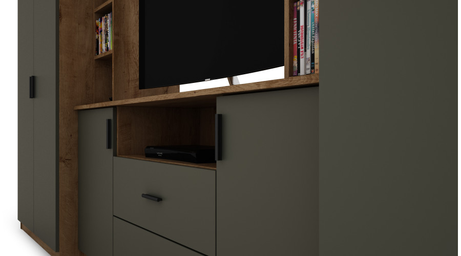 Centrinė televizijos zona su lentyna buvo suprojektuota kaip organizuotas gyvenamosios erdvės akcentas. Apatinės spintelės ir erdvūs stalčiai leidžia estetiškai laikyti multimedijos įrangą, dokumentus ir priedus, padeda palaikyti tvarką svetainėje neprarandant funkcionalumo.