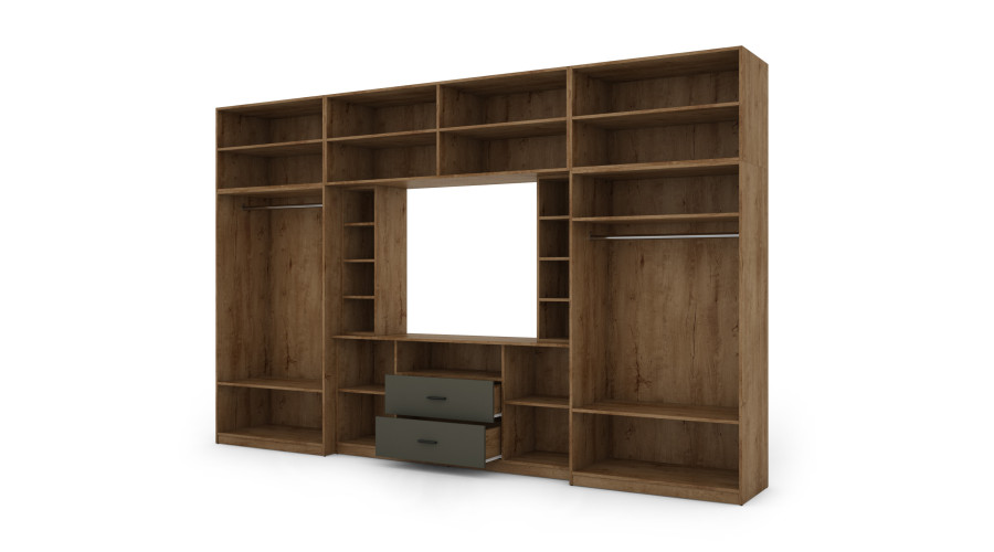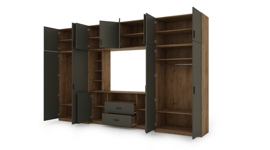 Multimedijos zonos priekyje yra dvi labai erdvios spintos su pakabų bėgeliais ir lentynomis. Tai leidžia DAKO sieninei spintelei pasiūlyti daug vietos daiktams susidėti ir ją galima naudoti kaip įmontuojamą spintą, ypač ribotos erdvės butuose. Viršutinė komplekto dalis buvo išplėsta iki lubų siekiančiais prailginimais, sujungiančiais uždarus segmentus su atviromis lentynomis ir stiklo elementais. Šis sprendimas leidžia praktiškai laikyti ir estetiškai eksponuoti knygas, dekoracijas ir suvenyrus, tuo pačiu suskaidydamas didelę baldų tūrį.