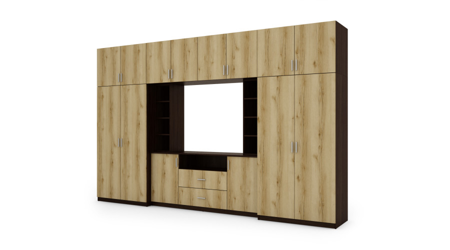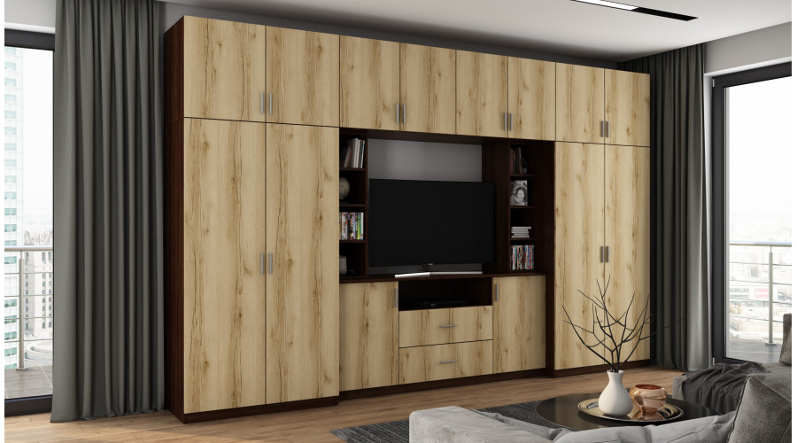 „DAKO“ sieninė spintelė, kurios spalvų paletė „Dark Sonoma“ / „Natural Grand Oak“, kurios matmenys – 380 x 240 cm, – yra elegantiška svetainės spintelė, kurioje dera natūralios medienos šiluma ir gilesnis, įtaigesnis atspalvis. Šis kontrastas suteikia spintelei išskirtinį, tačiau harmoningą charakterį, puikiai tinkantį tiek klasikiniam, tiek moderniam interjerui.