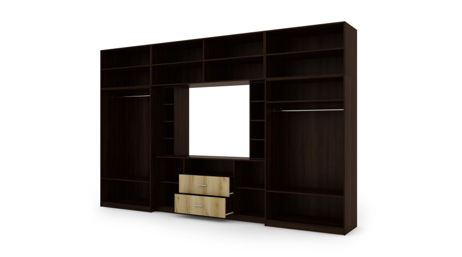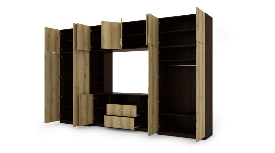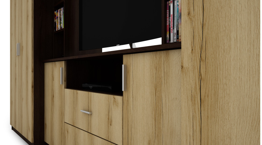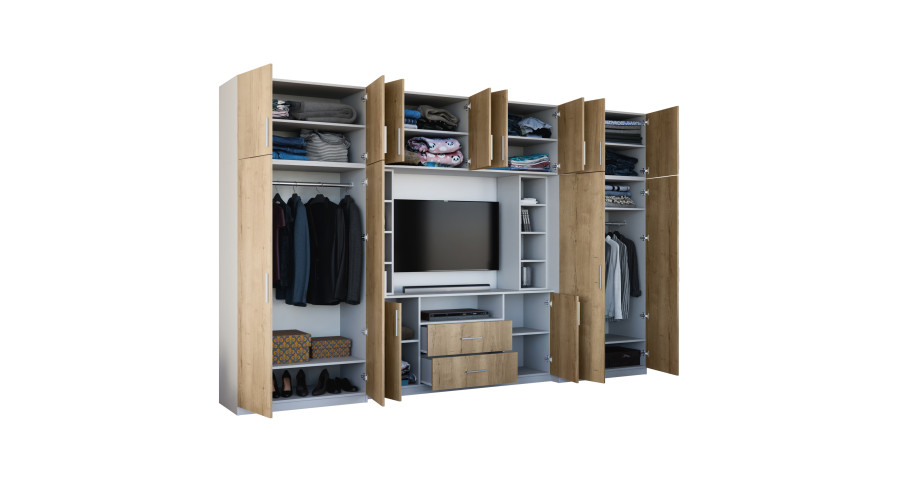 Priešais televizoriaus zoną yra dvi labai erdvios spintos su drabužių kabyklomis ir lentynomis. Šis sprendimas žymiai padidina talpą ir leidžia DAKO sieninę spintelę naudoti ir kaip praktišką spintą, ypač butuose, kur svarbu efektyviai išnaudoti erdvę. Viršutinėje komplekto dalyje yra iki lubų siekiantys praplatinimai, kurie jungia uždarus segmentus atviromis lentynomis ir stiklo elementais. Tai leidžia patogiai laikyti ir estetiškai eksponuoti knygas, dekoracijas ir suvenyrus, išlaikant darnią ir elegantišką formą.