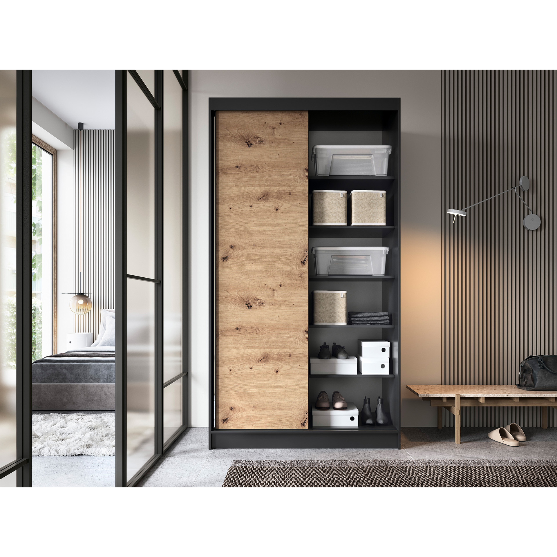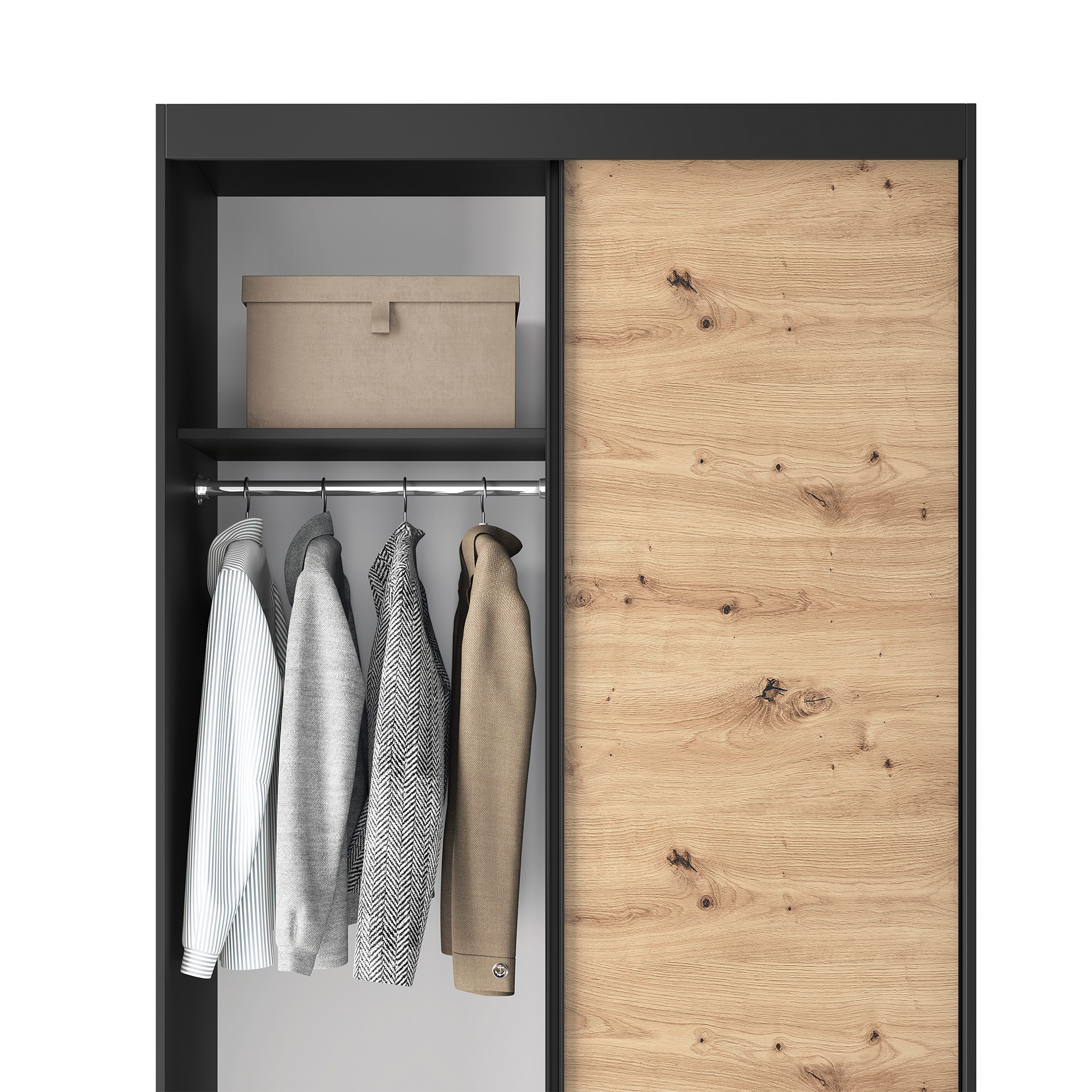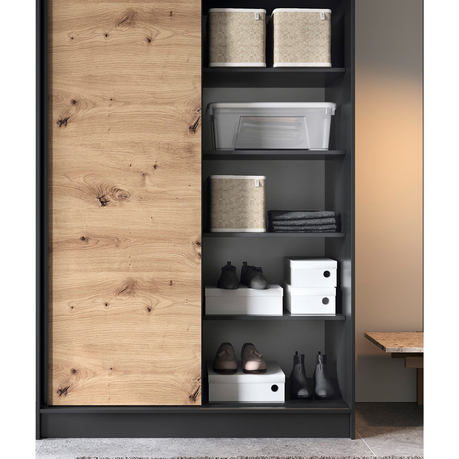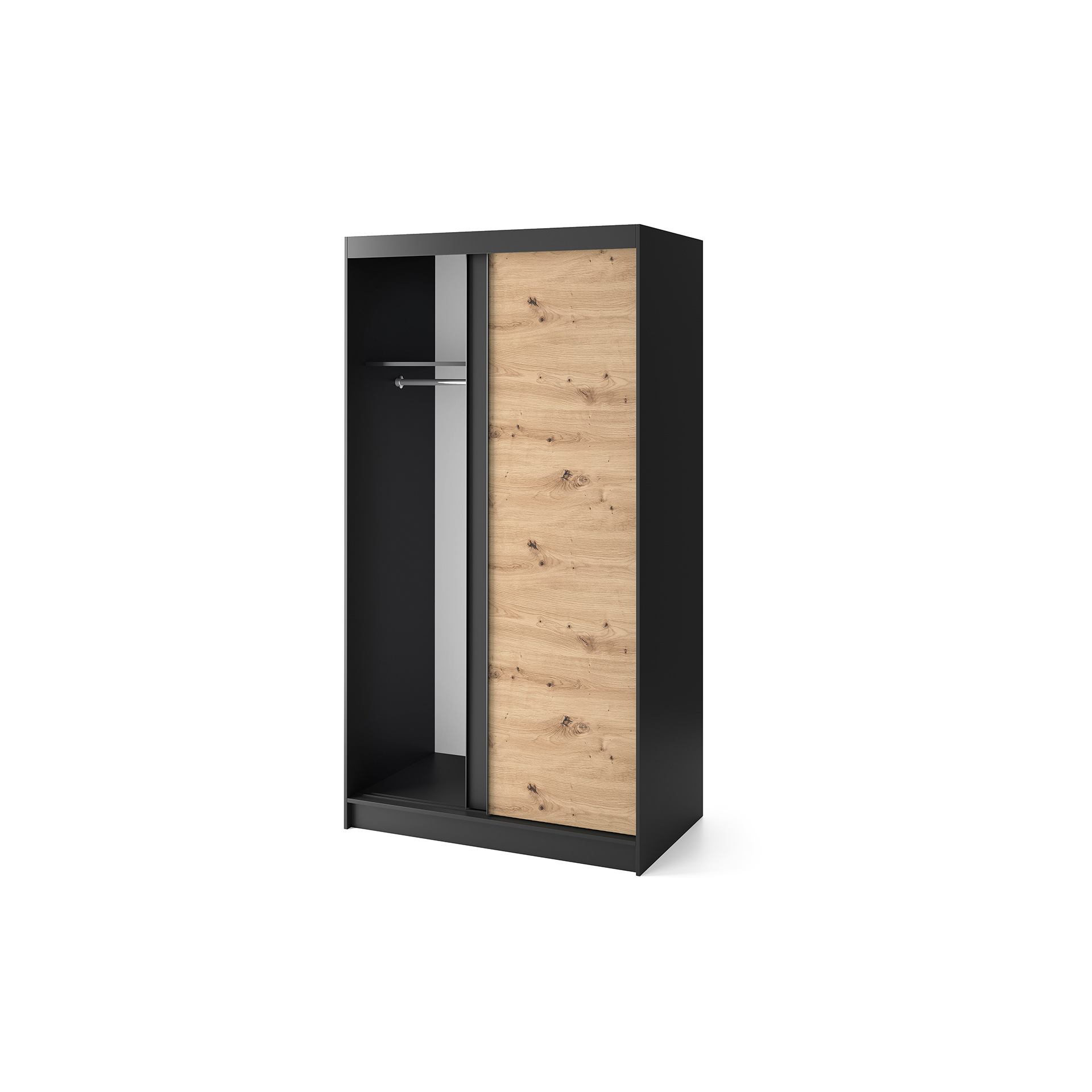 „Esville“ stumdoma spinta – puikus sprendimas jūsų erdvei sutvarkyti. Ji siūlo praktišką ir estetiškai patrauklų daiktų laikymo sprendimą, nereikalaujant papildomos vietos durims atidaryti. Jos matmenys – 60 cm gylio, 120 cm pločio ir 220 cm aukščio – puikiai tinka įvairiems interjerams. Pagaminta iš aukštos kokybės medžiagų, spinta yra patvari ir patikima. Spintos korpusas pagamintas iš 16 mm storio MDF plokštės, užtikrinančios stabilumą ir tvirtumą. ABS kraštai apsaugo baldus nuo pažeidimų ir suteikia jiems elegantišką išvaizdą. Vidus buvo sumaniai suprojektuotas taip, kad būtų galima optimaliai išnaudoti erdvę. Spintoje yra šešios lentynos, kurių kiekvienos keliamoji galia yra iki 10 kg, todėl galima laikyti įvairius daiktus. Pridedami pakabinimo bėgeliai leidžia pakabinti drabužius, užtikrinant tvarką ir lengvą prieigą. Dvejos stumdomos durys leidžia patogiai atidaryti ir uždaryti spintą neužimant papildomos vietos. Tai leidžia lengvai sutalpinti spintą net mažoje patalpoje. Spintos 0,5 cm aukščio kojelės pagamintos iš patvaraus plastiko, todėl ją lengva perkelti ir išlaikyti tinkamą aukštį stabilumui. Drabužių spintos ąžuolo ir matinės juodos spalvos suteikia jai modernų ir elegantišką charakterį, kuris sklandžiai dera prie įvairių interjero stilių. Trumpai tariant, „Esville“ stumdoma spinta yra praktiškas ir estetiškai patrauklus daiktų laikymo sprendimas, leidžiantis sutvarkyti erdvę neatidarant tradicinių durų. Tvirta konstrukcija, funkcionalumas ir modernus dizainas paverčia ją ne tik praktišku baldu, bet ir dekoratyviu jūsų interjero akcentu.