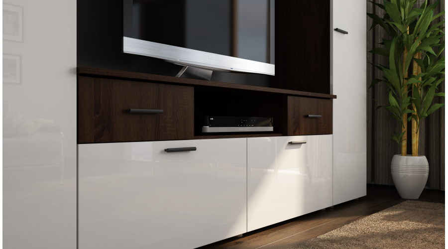 Įmontuojama sieninė spintelė su vieta televizoriui 240 × 190 cm Sonoma Ciemna / Biały Połysk – PLUTON