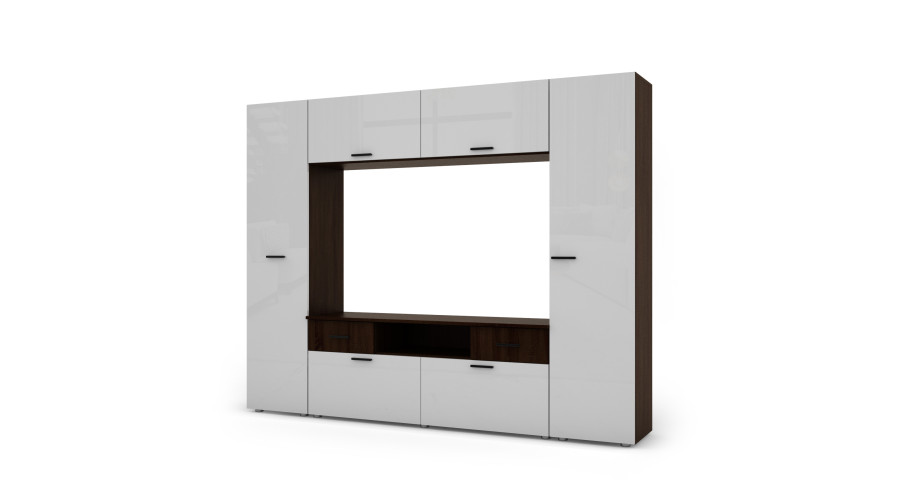 „Dark Sonoma“ apdailos ir balto blizgesio derinys suteikia sieninei spintelei modernų, kontrastingą charakterį. Tamsesnis pagrindas suteikia baldo formai struktūros, o žvilgantys, šviesūs fasadai vizualiai pagyvina komplektą ir suteikia lengvumo pojūtį, puikiai dera prie modernaus ir minimalistinio interjero dizaino.