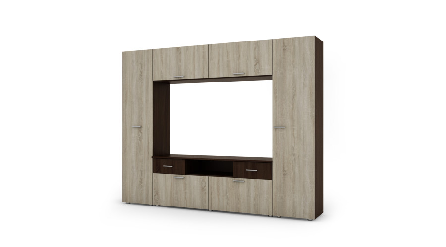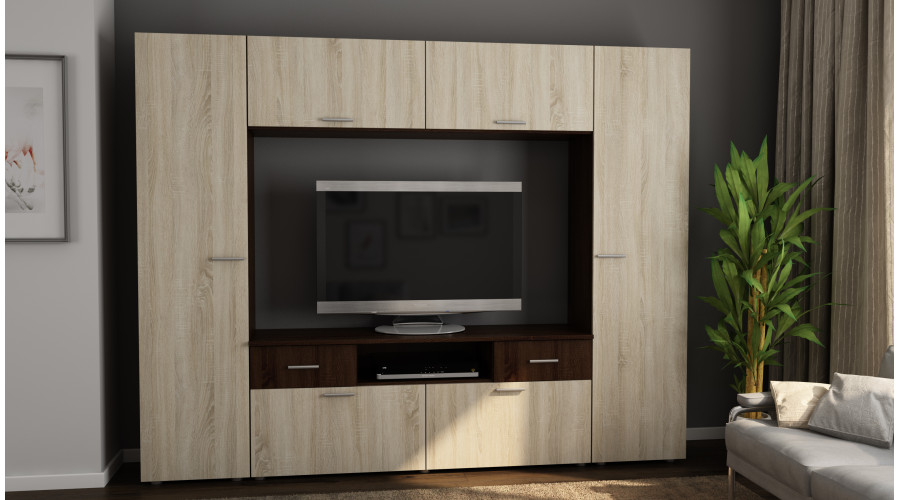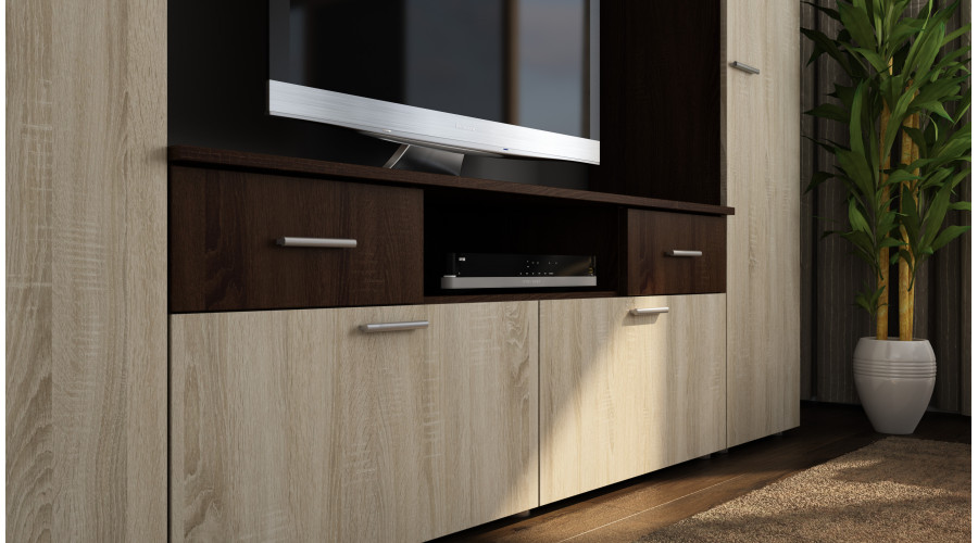 Centrinė komplekto dalis skirta televizoriui ir elektronikai. Apatinis blokas leidžia patogiai išdėstyti įrenginius ir priedus, o viršutinis praplėtimo blokas užbaigia visą bloką, sukurdamas vientisą rėmą aplink multimedijos zoną. Praplėtimo blokas tvirtinamas prie šoninių blokų, todėl nereikia jo tvirtinti prie sienos.