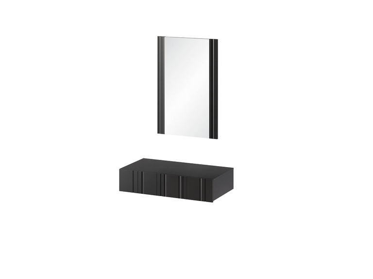 Juodas „Isla“ tualetinis staliukas yra elegantiškas ir funkcionalus prie sienos kabantis baldas. Jame yra praktiškas stalčius su dekoratyviniu, grioveliais išraižytu priekiu, kuriame yra vietos kosmetikai ir smulkiems daiktams. Komplektą sudaro stačiakampis veidrodis, kurio šonai dekoruoti stilingais grioveliais, pabrėžiančiais viso baldo modernų charakterį. Idealus pasirinkimas miegamajam ar persirengimo kambariui, derinantis estetiką su paprastu naudojimu.