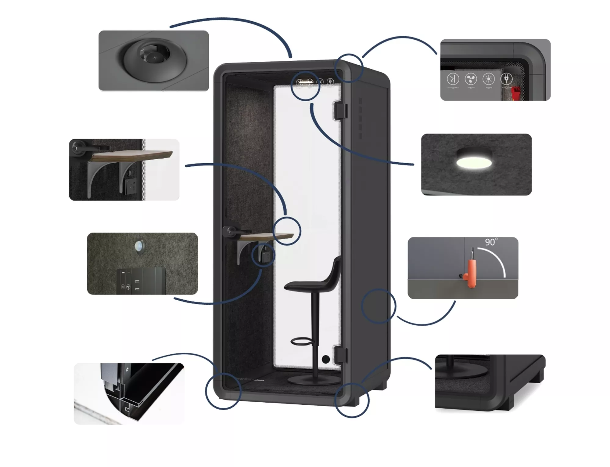 Vieno asmens akustinė kabina moderniam biurui. Ši moderni, garsui nepralaidi akustinė kabina puikiai tinka moderniems atviro plano biurams, vyriausybinėms įstaigoms, oro uostams ir viešbučiams. Kabina leidžia skambinti telefonu arba vesti konferencinius skambučius patogioje aplinkoje, kur galite sutelkti dėmesį į pokalbį ir vesti jį netrukdydami kolegoms. Stiklinės durys ir kabinos galinė dalis suteikia kabinai nepaprastai šviesią išvaizdą ir padidina jos užimamą vidinę erdvę. Ši maža, praktiška telefono kabina bus ypač naudinga moderniame biure, kuriam būdingos inovacijos ir modernių sprendimų taikymas. Kabina pagaminta iš aukštos kokybės medžiagų, užtikrinančių tinkamą garso izoliaciją. Interjero dizainas ir apdaila skatina naudoti šią patogią erdvę, kai tik prireikia. Papildomi produkto privalumai: Praktiška lentyna – stalviršis kompiuteriniams įrenginiams ar biuro reikmenims, reikalingiems pokalbių metu. 4000K / 421LM natūralaus apšvietimo sistema. Išcentrinis ventiliatorius, kuris keičia orą kabinos viduje. Judesio jutiklis ir jungiklis, valdantys apšvietimą ir ventiliatorių. Akustinė izoliacija ir triukšmo mažinimas apie 25 dB ± 3 dB. Saugi vieta pokalbiams, kabinoje taip pat yra avarinis saugos plaktukas. Kabina netrukdo „Wi-Fi“ tinklui ar kitiems duomenų perdavimo signalams. Medžiaga: grūdintas stiklas Spalva: juoda / pilka standartinė Išoriniai matmenys: Aukštis: 234,6 cm Plotis: 100 cm Gylis: 93,6 cm Vidiniai matmenys: Aukštis: 214 cm Plotis: 84 cm Gylis: 90 cm Garso izoliacija: 25 dB Maitinimo tipas: 100-240V/50-60Hz