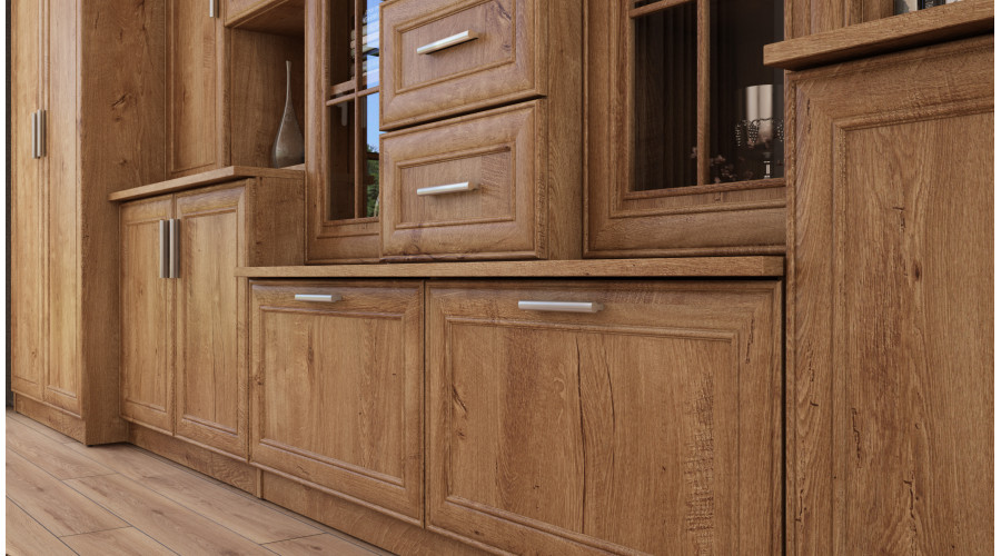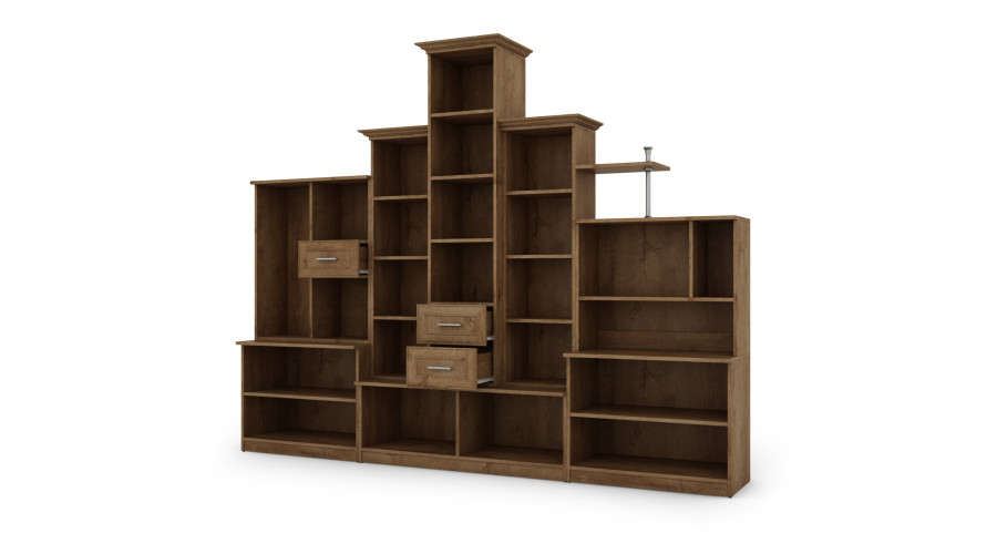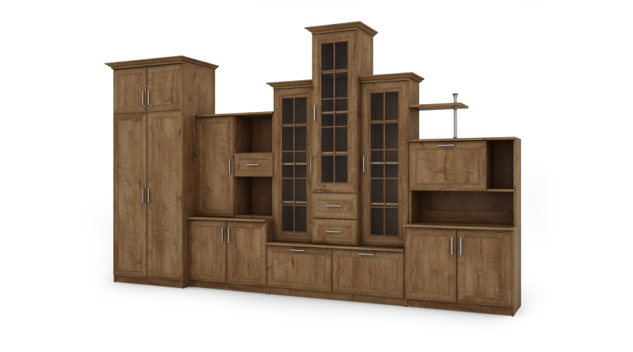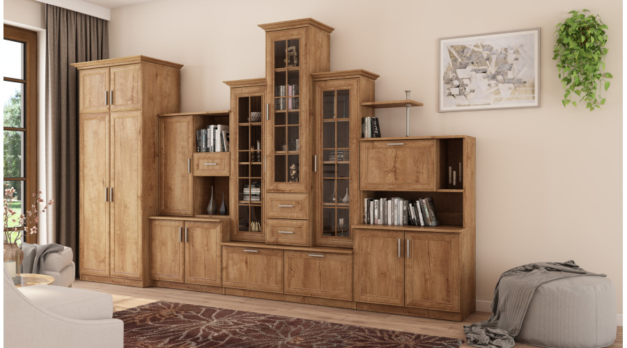 Centrinis komplekto elementas – įspūdinga trijų dalių vitrina, suteikianti sieninei spintelei reprezentatyvumo ir sutvarkanti viršutinę jos dalį. Stikliniai fasadai kartu su dekoratyvinėmis MDF juostelėmis leidžia estetiškai eksponuoti knygas, stiklinius indus, kolekcijas ar dekoracijas, išlaikant klasikines viso komplekto proporcijas.