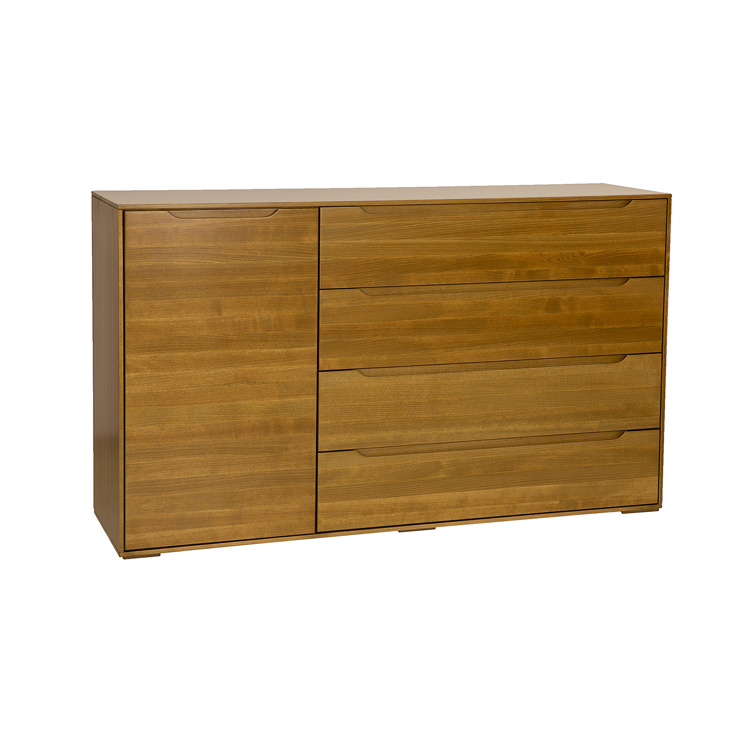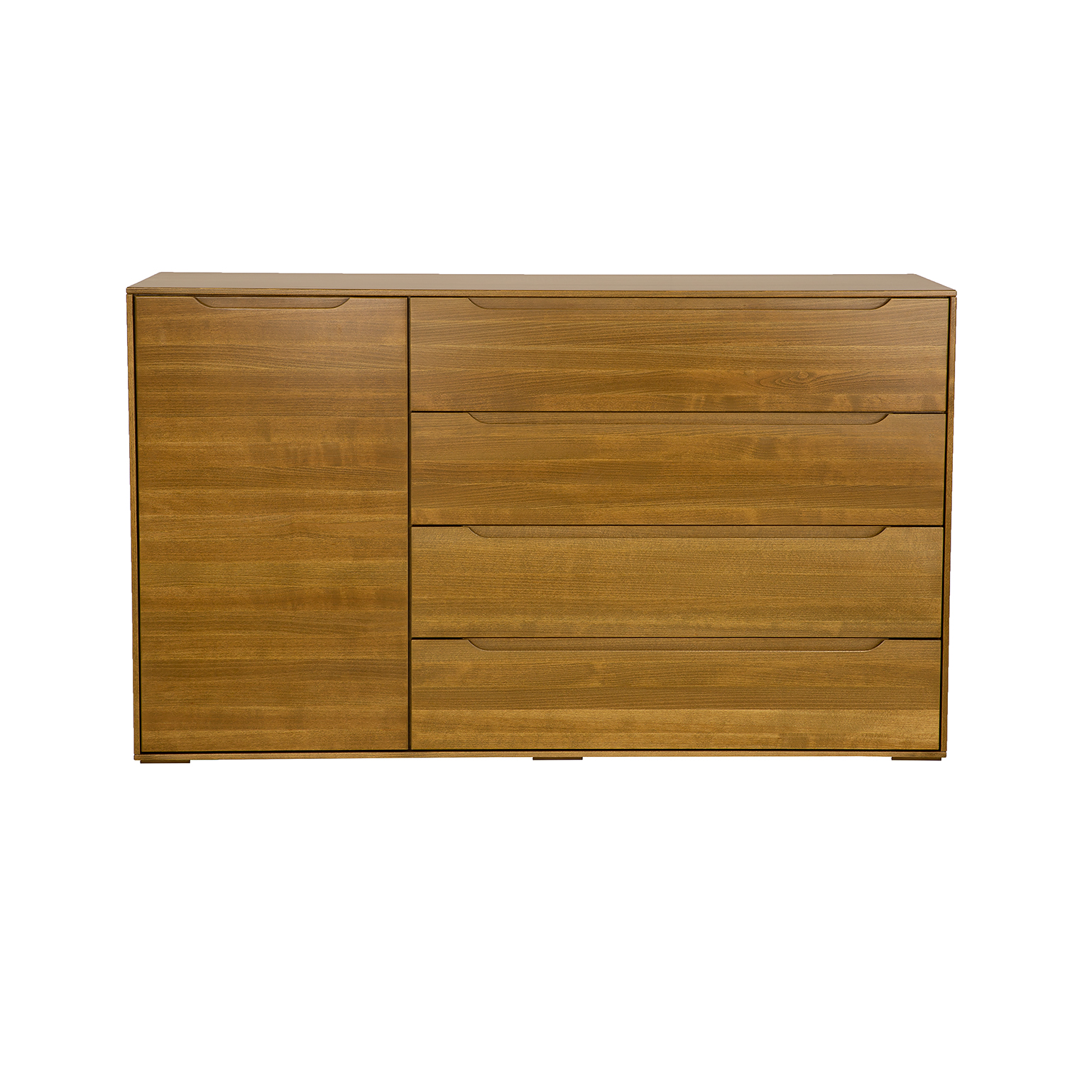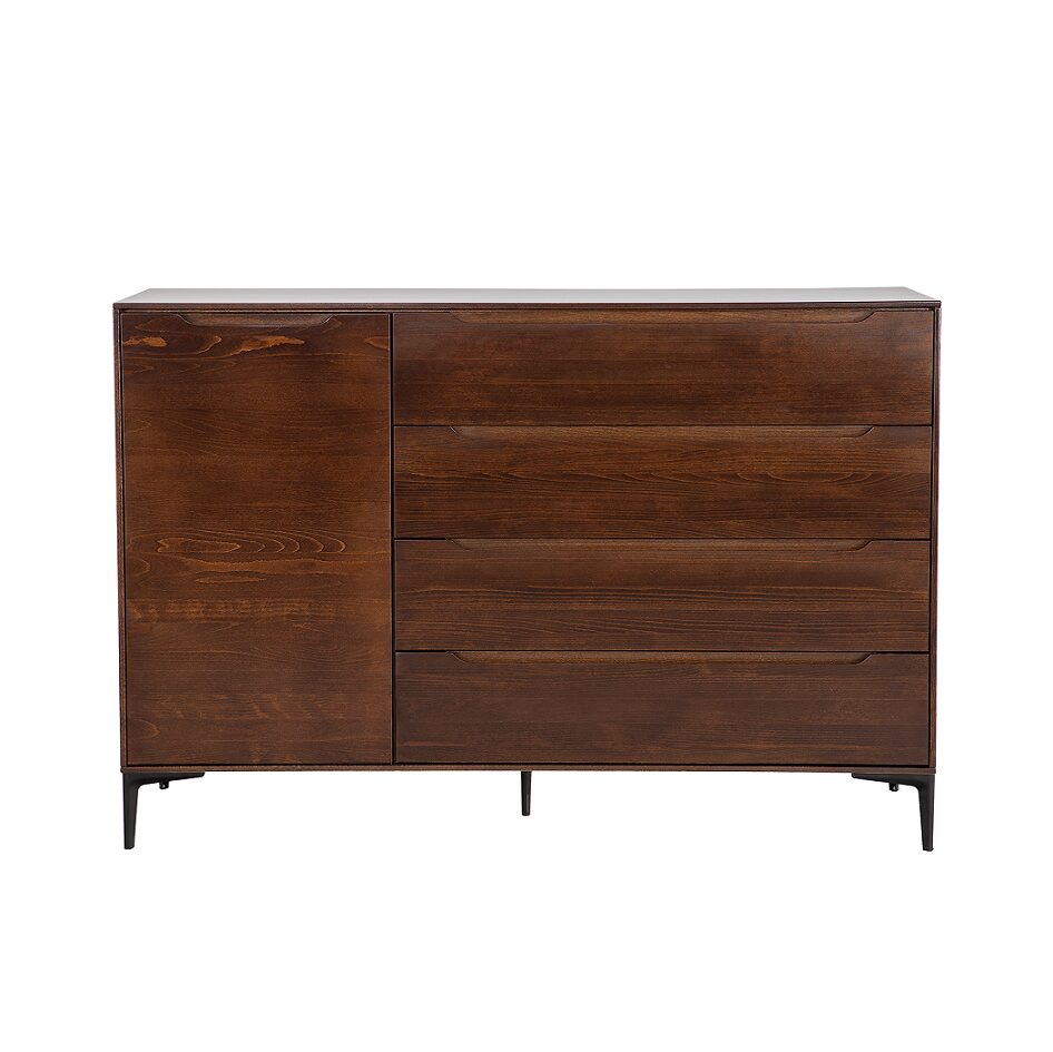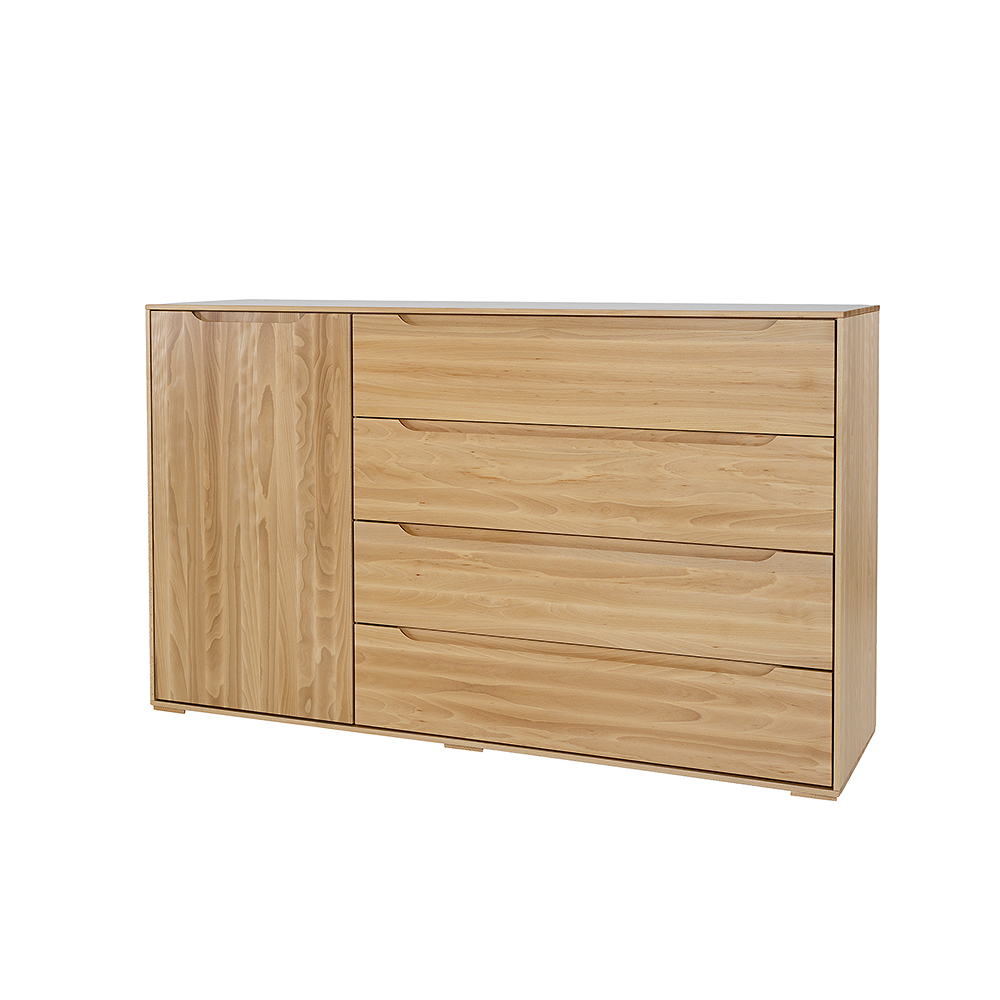 Buko medienos komoda KD423 iš „Modern“ kolekcijos buvo sukurta galvojant apie modernaus minimalizmo mėgėjus. Nepaisant paprastos formos, ji žavi ir traukia dėmesį nuo pat pirmos akimirkos, kai įžengiate. Tvirtus, paprastus fasadus papildo subtilios, raižytos medinės rankenėlės, kurios sukuria atidarymo ir uždarymo sistemą. Erdvi spintelė ir funkcionalūs stalčiai puikiai tinka laikyti daugybę namų aksesuarų. Dar vienas privalumas – didelis buko medienos stalviršis, ant kurio gražiai atrodys šeimos relikvijos ar nuotraukos. Komoda stovi ant mažų medinių kojelių. Papildomai galima įsigyti 10 cm aukščio aliuminio kojeles (NG002) ir 15 cm aukščio metalines kojeles (NG003). Tai leidžia lengvai ir visiškai pakeisti baldo charakterį ir stilių.
