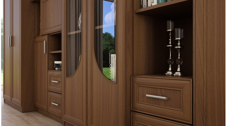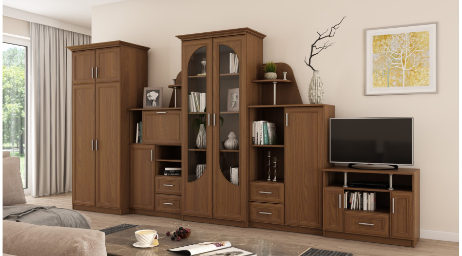 Centrinis komplekto elementas – stiklinė vitrina, leidžianti estetiškai eksponuoti stiklinius indus, dekoracijas ar kolekcijas, tuo pačiu vizualiai sutvarkant labai platų bloką. Klasikinė forma, derinama su dekoratyvinėmis MDF juostelėmis, išlaiko visos sieninės spintelės simetriją ir proporcijas. Vitrinos plotą papildo baras ir patalynės spinta, kurios padidina komplekto funkcionalumą kasdieniame naudojime.