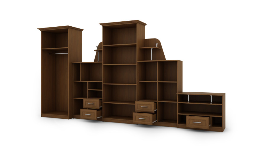 Svarbus šio varianto elementas – erdvi viso dydžio spinta su pakaba ir lentyna. Tai leidžia sieninei spintelei tarnauti kaip pagrindinei drabužių ir tekstilės gaminių laikymo vietai, todėl kambaryje nereikia papildomų spintų. Komplektą papildo televizoriaus staliukas, leidžiantis patogiai pastatyti televizorių ir multimedijos įrangą. Televizoriaus zona integruota į bendrą spintelę taip, kad atitiktų klasikinį sieninės spintelės charakterį, tačiau nedominuotų jos reprezentacinėje formoje.