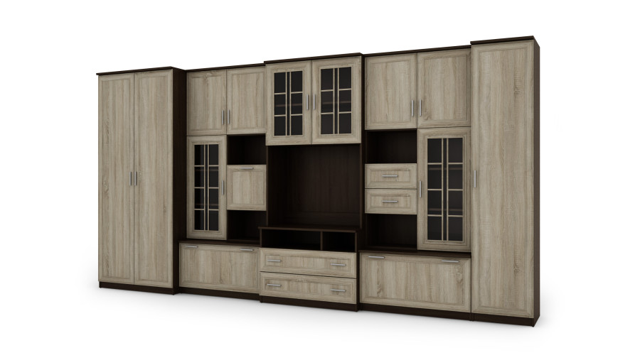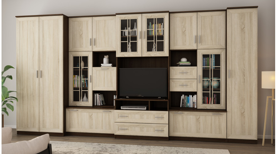 Tamsiai sonoma ir šviesiai sonoma spalvų derinys suteikia sieninei spintelei natūralumo ir pusiausvyros įspūdį. Medžio atspalvių kontrastas vizualiai sutvarko struktūrą ir leidžia spintelei dera tiek prie klasikinių, tiek prie santūraus gyvenamųjų erdvių išdėstymo.