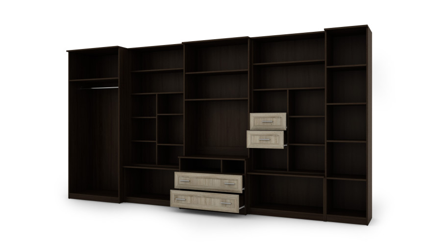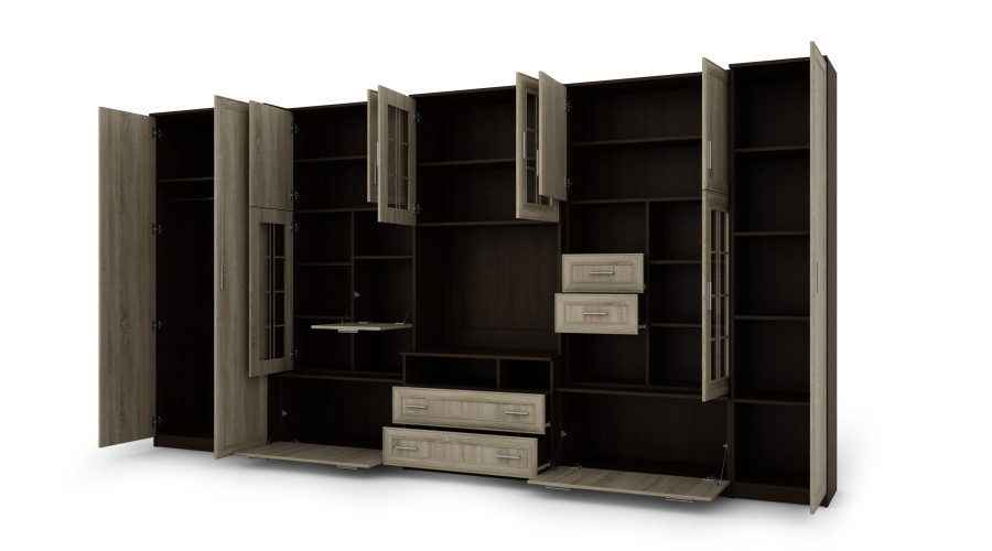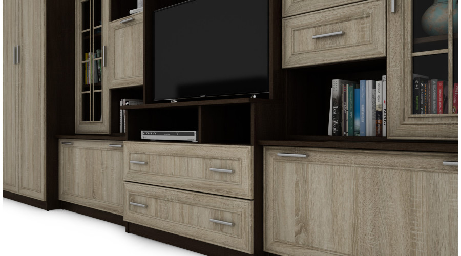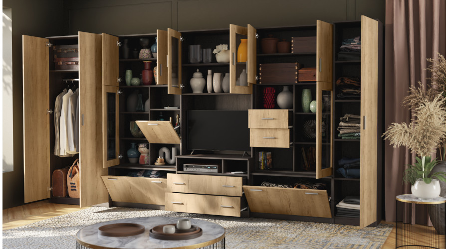 Centrinėje komplekto dalyje yra televizoriaus staliukas su didele niša televizoriui ir erdviais stalčiais, skirtais patogiai laikyti multimedijos priedus. Šalia jo yra labai erdvi spinta su pakaba ir lentyna, taip pat penkių lentynų spintos kolona, skirta lengvai susitvarkyti drabužius, tekstilę ir aksesuarus.