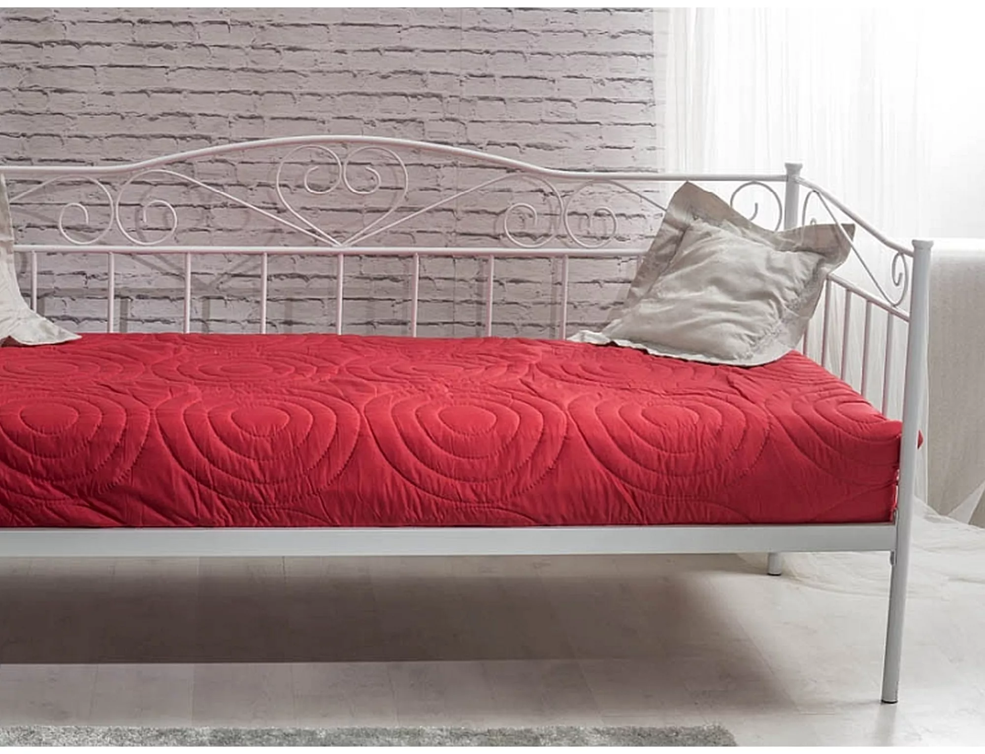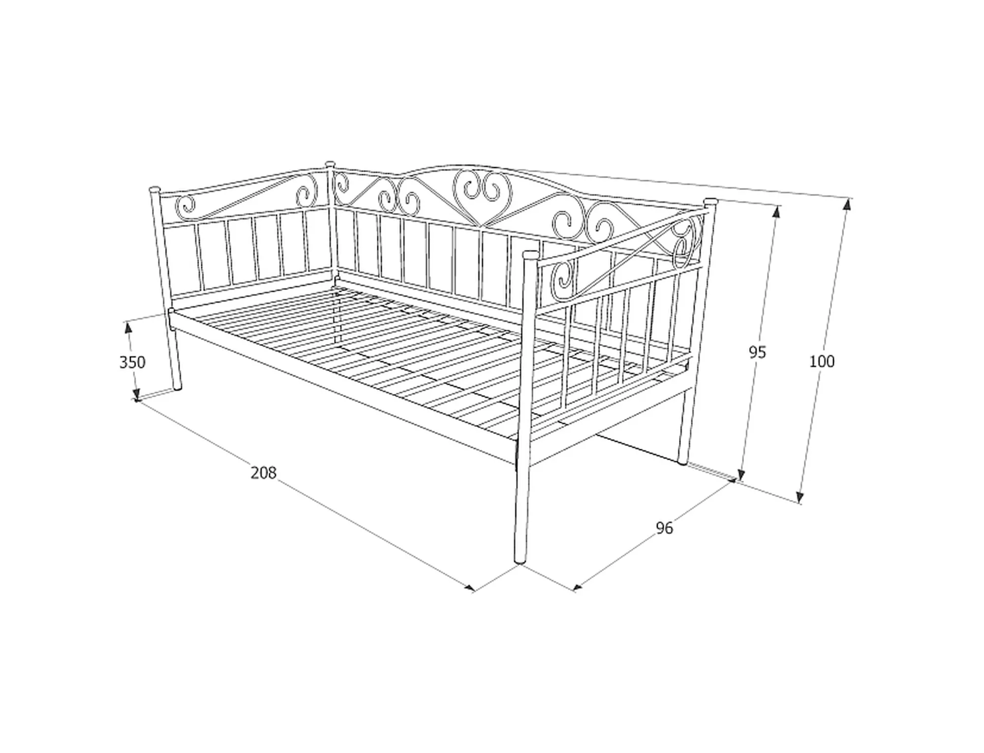 Lova, medžiaga: metalas, spalva: balta. Komplekte yra rėmas, pagamintas iš metalinių profilių, standžiai pritvirtintų prie lovos rėmo. Čiužinio dydis: 90x200cm (kaina be čiužinio). Lovos matmenys: A – 208, B – 96, H – 100, C – 90×200, D – 30, E – 2, F – 5, G – 90 cm.