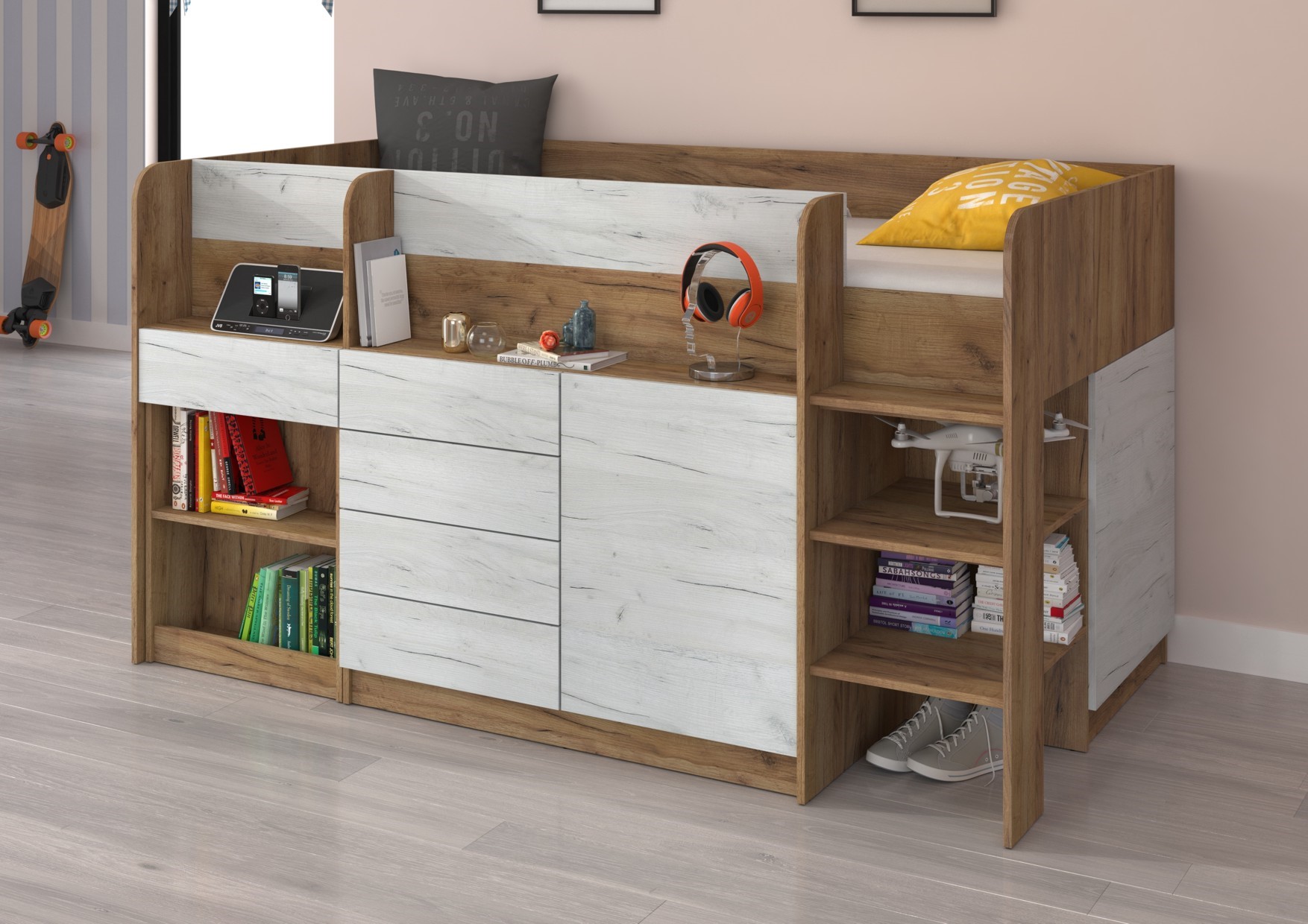 EMI P antresolė be čiužinio. 16 mm plokštė, ABS kraštas, atidaroma PASPAUSDANT, maksimalus čiužinio aukštis 12 cm. Spalva: auksinis ąžuolas / baltas ąžuolas.