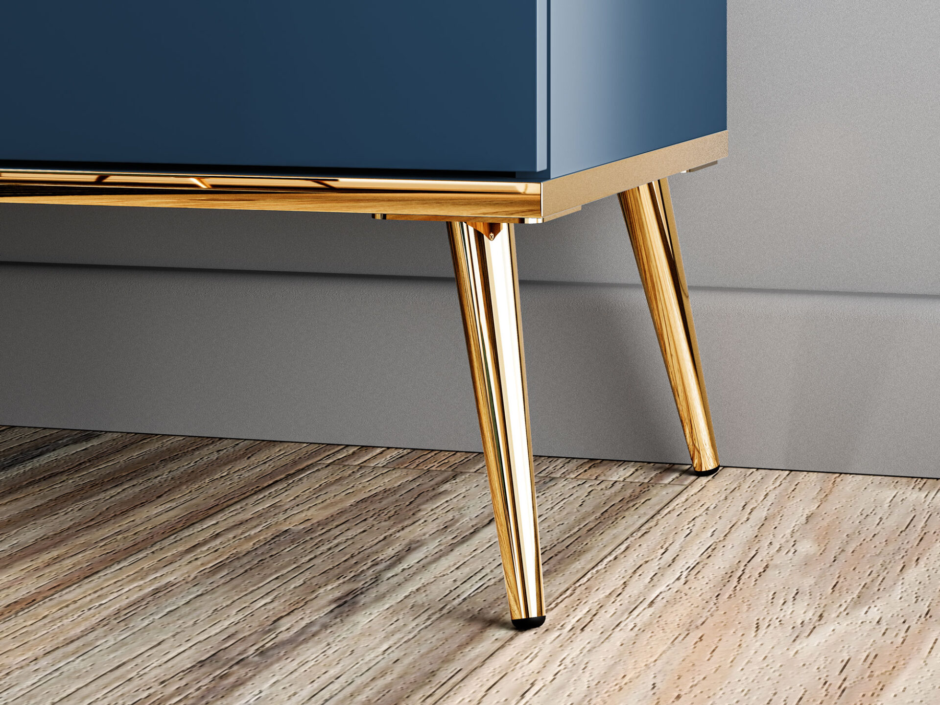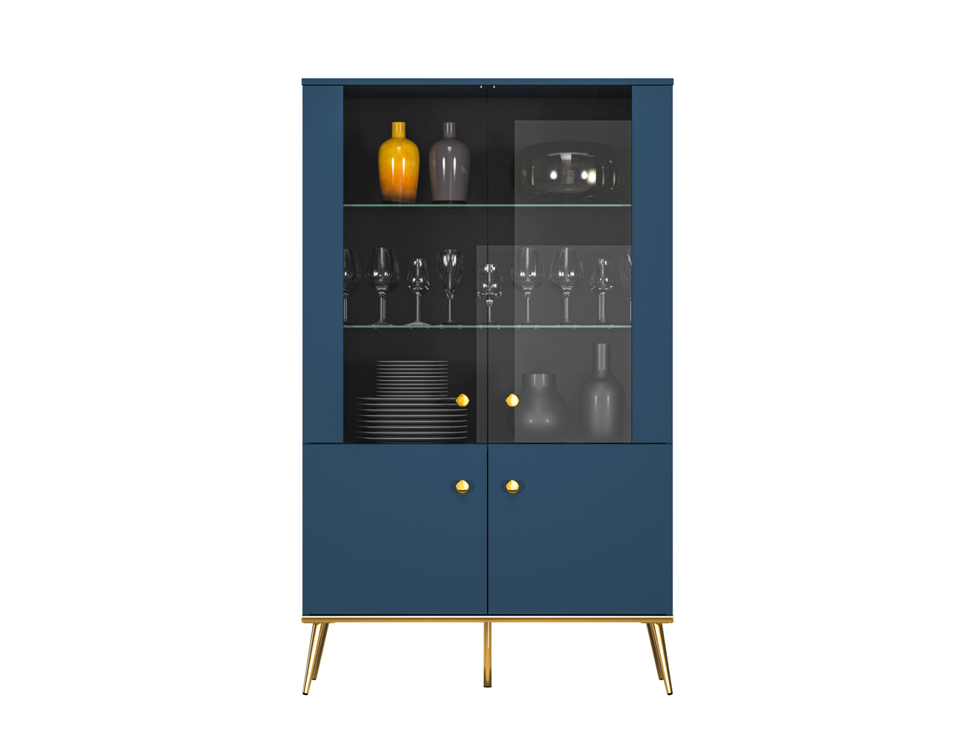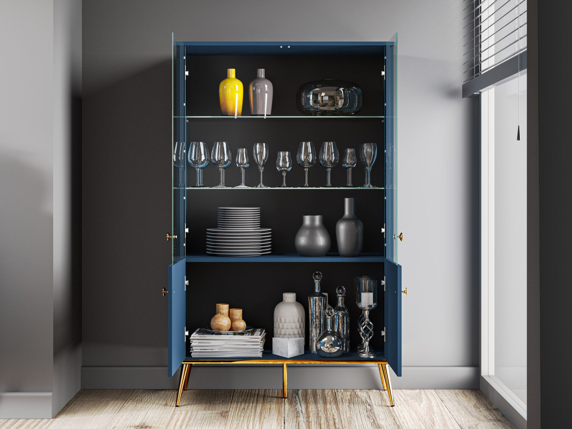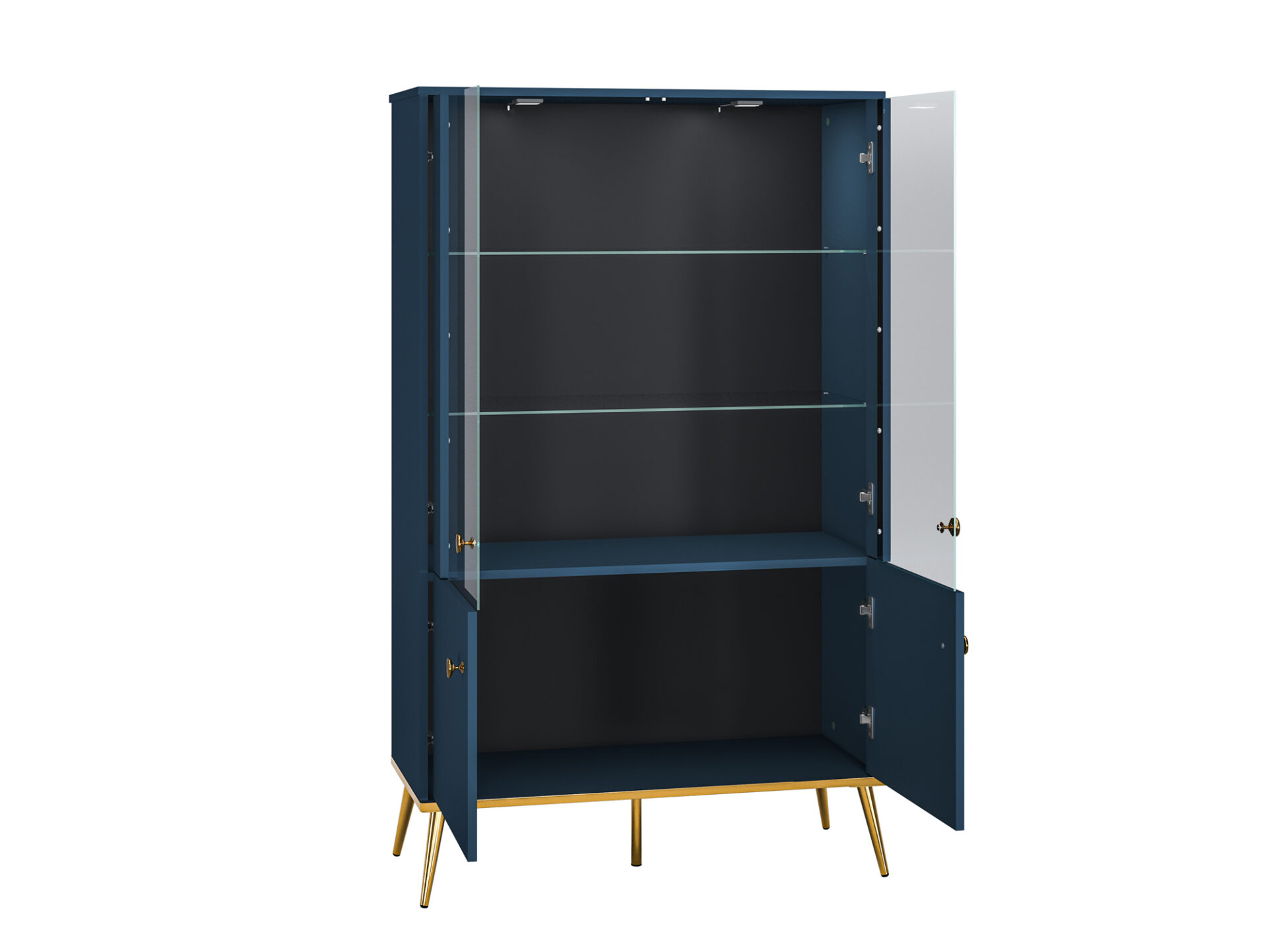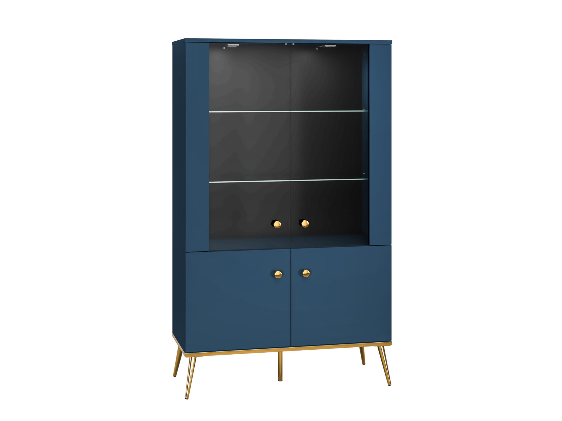 „Marine 02“ vitrina – tai baldas, puikiai tinkantis stalo įrankiams, vazoms ar kelionių suvenyrams eksponuoti, taip pat staltiesėms ir stalo įrankiams laikyti. Dvi stiklinės lentynos, padalijančios erdvę už stiklinių durelių į tris plačias nišas, leis dar lengviau ir maloniau laikyti mėgstamus daiktus. Viršutinis LED apšvietimas dar labiau išryškins jūsų daiktus. Papildomas dvigubas šviesos šaltinis pagerins bendrą patirtį. Apatinė dalis, uždaryta dvigubomis durimis, siūlo didelę ir erdvią vietą daiktams, kuriuos norite paslėpti, pavyzdžiui, dokumentams ar namų tekstilei. Visiems „Marine“ kolekcijos baldams būdinga sodri, tamsiai mėlyna apdaila. Rankenos, kojelės ir apatinės plokštės fanera – dėl savo klasikinės auksinės spalvos – pabrėžia elegantišką ir nesenstantį „Marine“ baldų charakterį.