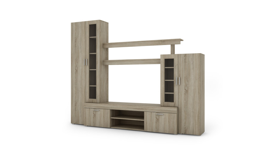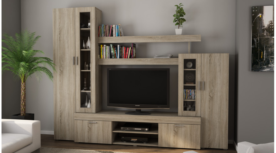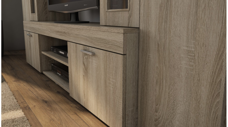 Maža sieninė spintelė su vitrina ir vieta televizoriui 266 × 210 cm Sonoma Jasna – APOLLO