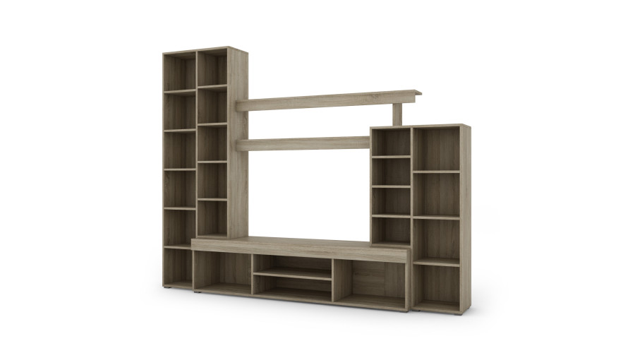 Komplektą sudaro spintelės, lentynos ir vitrina, leidžianti laikyti ir estetiškai eksponuoti knygas, dekoracijas ir kasdienius daiktus. Stiklinė vitrina suteikia subtilų akcentą, neužgoždama bendro dizaino.